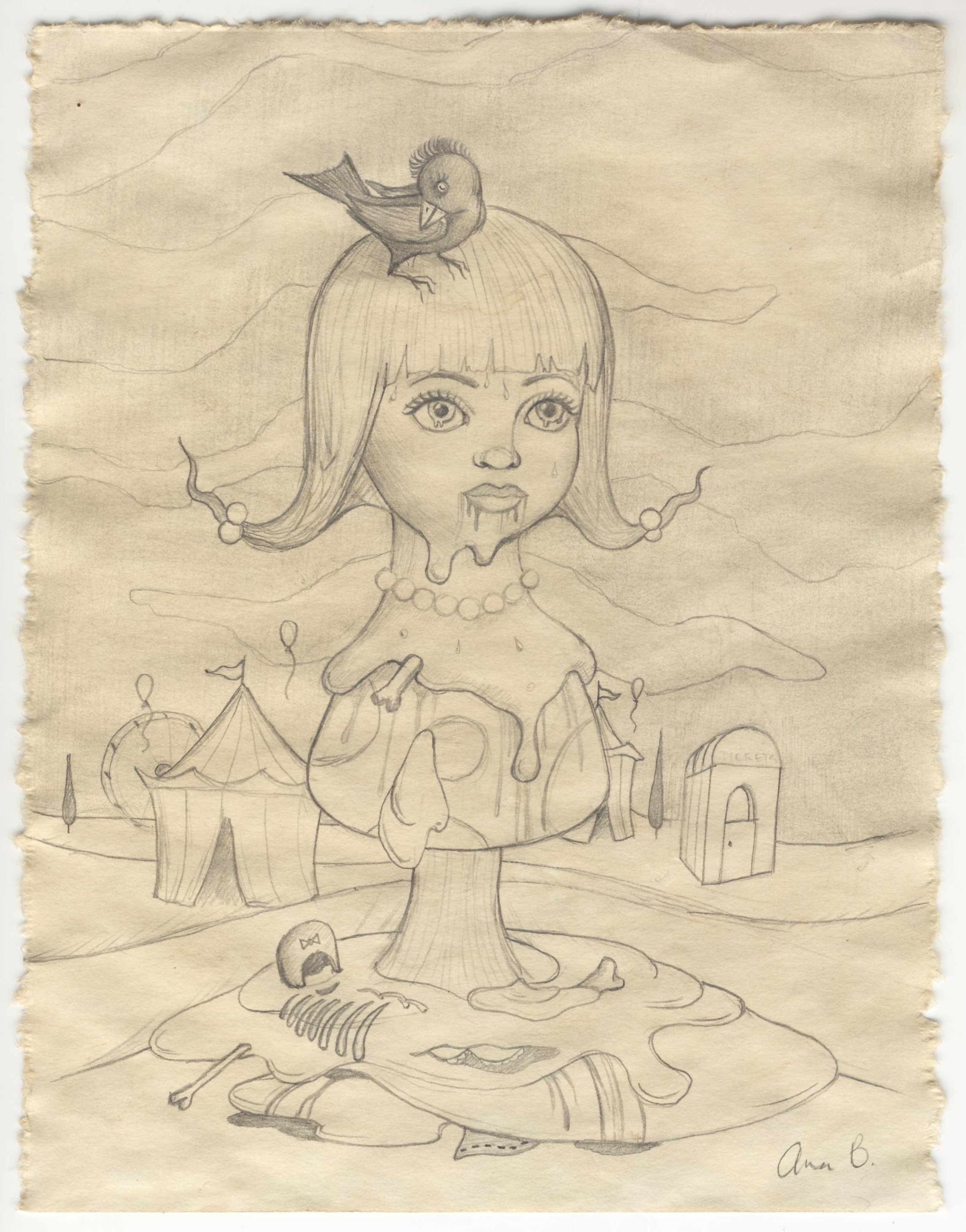 Whimsical sono anche le atmosfere evocate dalla pittura di Silvia Argiolas, che ritrae bimbe dagli occhi grandi sullo sfondo d’inquietanti scenari campestri e boschivi. In questi ritratti, influenzati tanto dallo stile super deformed quanto dall’estetica kawai, giocano un ruolo di co-protagonisti i nugoli di coniglietti mutanti, d’insetti ronzanti e minacciosi uccelli notturni, che formano una sorta di bestiario immaginifico e surreale. Con il suo stile gotico-folk, anche l’artista sarda dipana il racconto di un’infanzia ferita e bistrattata, cui non resta che il conforto dei paradisi artificiali offerti dalle droghe e dagli psicofarmaci. Argiolas adotta, quindi, gli stilemi formali della cuteness piegandoli però alle esigenze di una rappresentazione critica della società contemporanea.