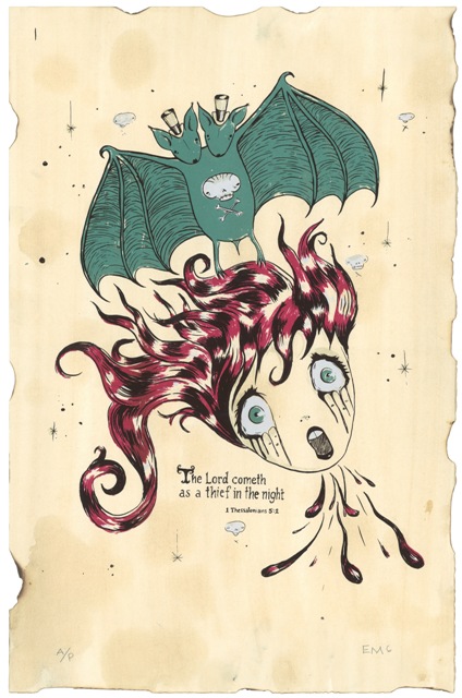 Lo stesso si potrebbe dire dei personaggi raffigurati nelle due stampe di Elizabeth McGrath, se non fosse per la prossimità con lo stile grafico di Tim Burton[12]. Nata nel 1971 a Hollywood, l’artista lavora principalmente nel campo della scultura e dell’animazione, rappresentando il lato oscuro della vita, tanto da meritarsi l’appellativo di Liz “Bloodbath” McGrath (Liz “bagno di sangue” McGrath). Nei suoi disegni si fondono gli influssi dell’iconografia cattolica, dell’immaginario carnevalesco e dell’estetica punk. La McGrath ha iniziato la sua carriera disegnando la fanzine Censor this ed è diventata, in seguito – oltre che la lead vocalist della band denominata Miss Derringer – una delle voci più originali della scena lowbrow californiana. Insieme a Camille Rose Garcia, l’artista rappresenta, infatti, l’anima più gotica (e critica) della compagine pop surrealista.