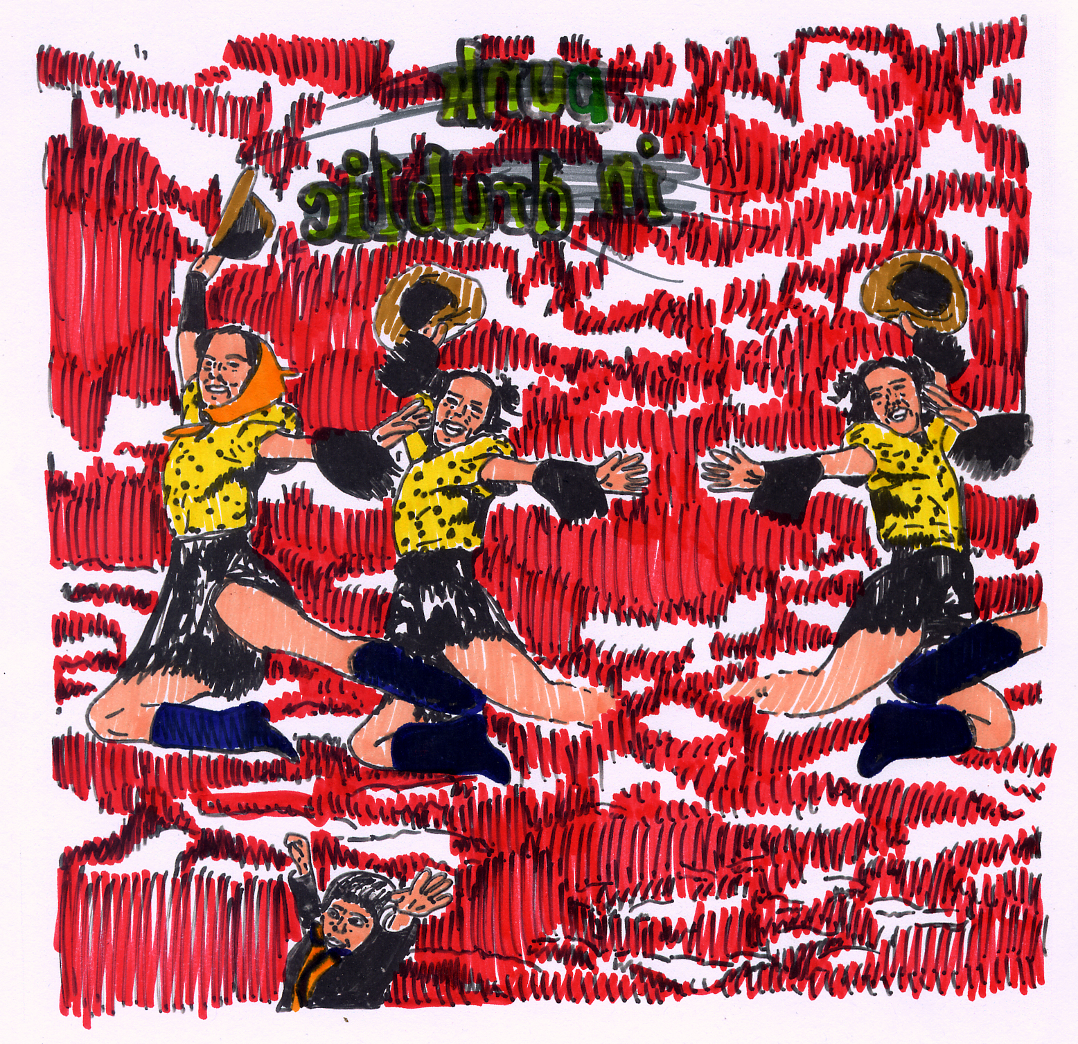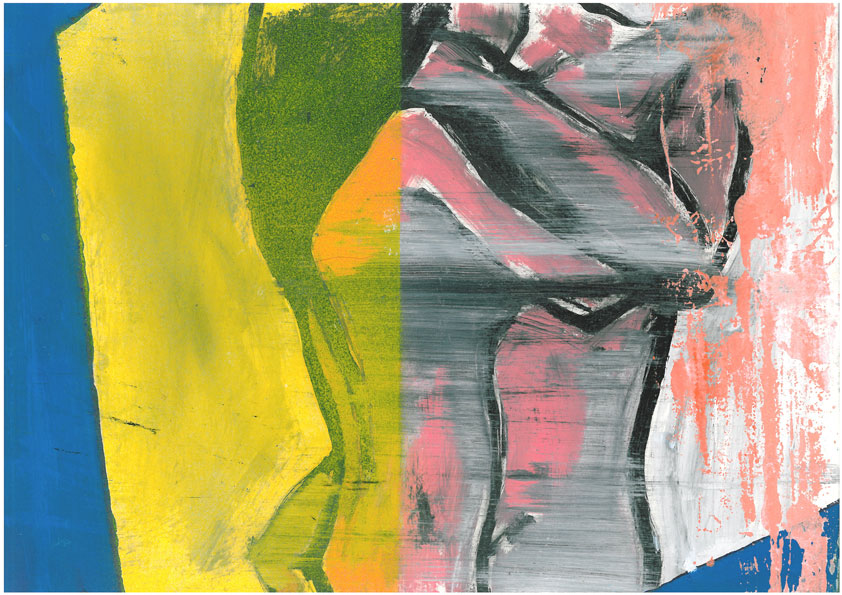 Uno stile conciso e raffinato è quello di Elena Monzo, che dipinge figure caratterizzate da una fisicità drammatica, da una corporeità estrema ravvisabile nelle posture complicate e contorte. Protagoniste delle sue opere, eseguite su carte da plotter, spesso con l’ausilio di pennarelli e sticker, sono figure antitetiche rispetto a quelle delle riviste patinate di moda. I suoi personaggi, infatti, sono quasi sempre donne con malformazioni o mutilazioni o addirittura ibridate e confuse in nuove entità organiche. Interessata al tema dei rapporti di dipendenza che uniscono le persone, l’artista stabilisce tra i personaggi che abitano lo spazio lindo e asettico dei suoi lavori una sorta di connessione, un legame di ordine fisico (quasi un cordone ombelicale) che li avvince in una stretta morsa.