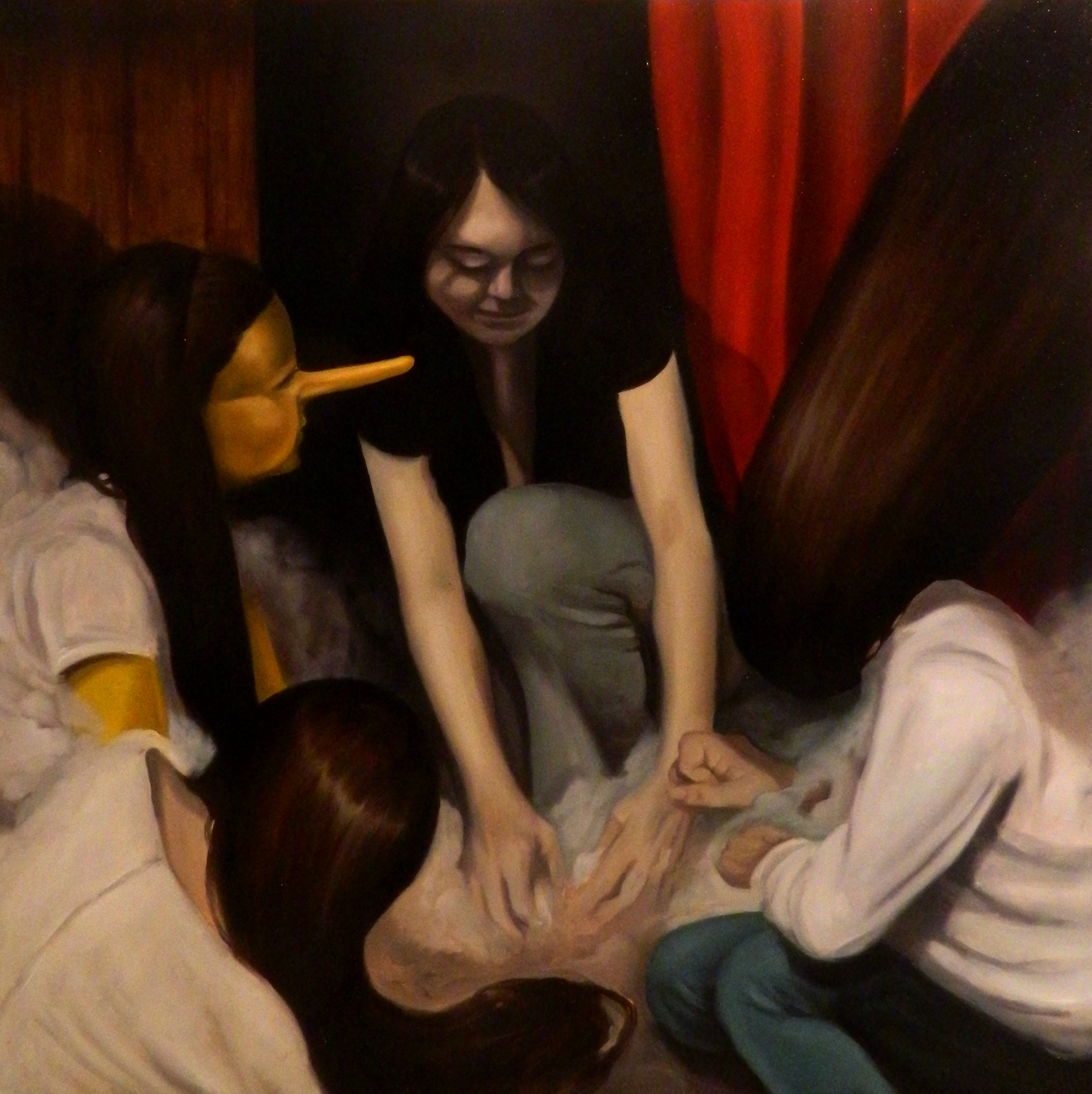 Cromaticamente opposte a quelle di Paola Sala sono le opere di Ana Bagayan, artista originaria di Yeveran (Armenia), ma californiana d’elezione. Laureatasi all’Art Center College of Design di Pasadena e svezzata professionalmente dalla galleria La Luz De Jesus di Los Angeles, Ana Bagayan è il tipico prodotto dell’educazione artistica della West Coast. Conosciuta in Italia per aver realizzato l’immagine della locandina del film H2Odio di Alex Infascelli e recentemente anche quella dell’album Un’altra me di Syria, l’artista ha elaborato un linguaggio pittorico caratterizzato da un forte imprinting illustrativo e dominato un impianto cromatico giocato su toni caramellosi e zuccherini. Eppure, il mondo onirico e fiabesco da lei rappresentato è percorso da una vena di sottile inquietudine e da un senso d’incombente minaccia che portano il clima della narrazione in una zona di confine tra incubo e idillio.