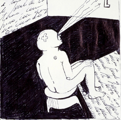 Topolino è un topos, ovvero un luogo comune del nostro immaginario, così come lo è il teschio, ecco perché Fantini preferisce sfumarne i contorni, annacquarli con una “pittura dubitativa”, fluida e mobile come l’incertezza. Indubitabili sono, invece, i mostri dell’inconscio, i vampiri della psiche che, soprattutto nei disegni, posseggono i tratti marcati e decisi del fumetto o dell’illustrazione, a metà strada tra le allucinazioni di Bacon e le follie lisergiche di Robert Crumb. Il nutrito campionario di personaggi psicotici che popolano le carte di Fantini (Verba Crucis, 2004), da Seimenomeno a Tennis was my favorite, da Crisi d’identità a Nix, fino a Ipersensibile e Sad Vehicle, assumono una più pastosa consistenza nelle tele. Qui, nell’infernale palcoscenico delle sue stanze, dove si aprono ulteriori squarci, quadri nel quadro come in un gioco labirintico di specchi, questi succubi “simpatici” si offrono allo sguardo benevolo dell’artista, tanto condiscendente verso la manifestazione delle nevrosi altrui, quanto severo nei confronti del filisteo “senso comune”.