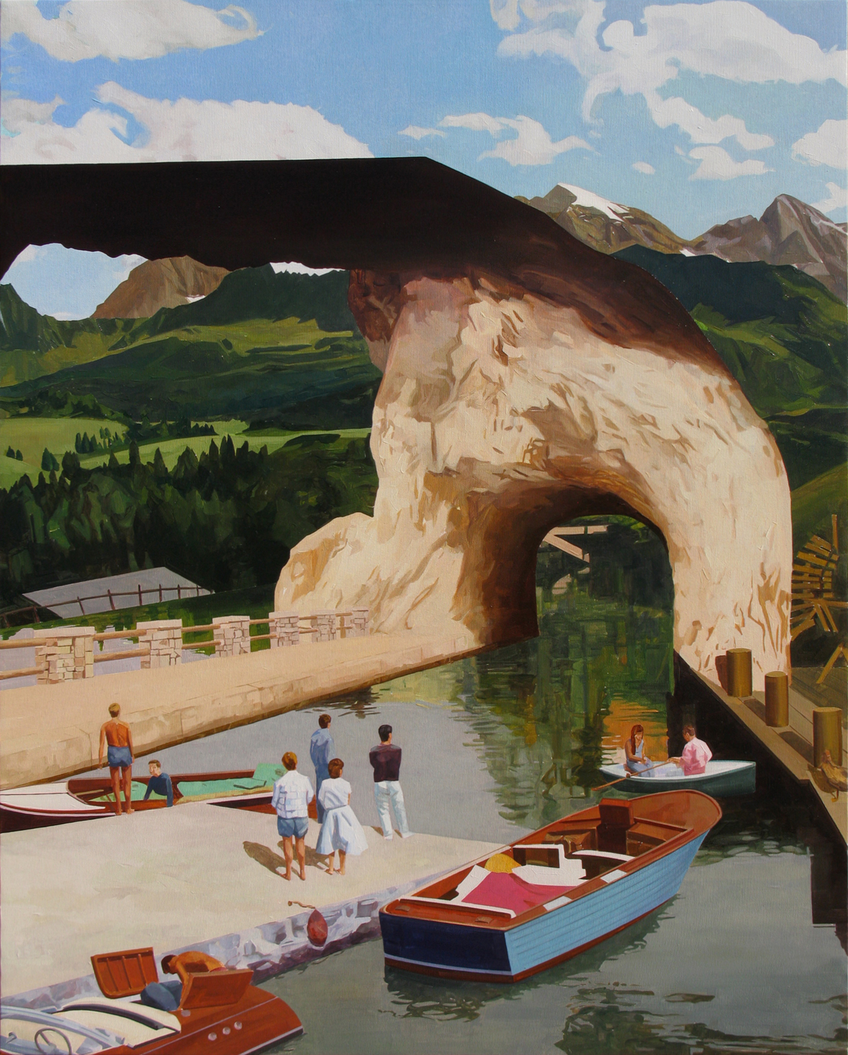 Piccola caverna conduce due amanti ad ammirare l’insolito lago, 2020, olio su tela, 125×100 cm.