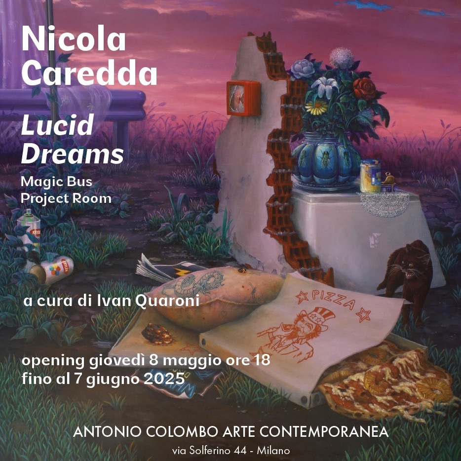 Le opere di Caredda sono dispositivi iperstizionali nel senso che non descrivono un futuro possibile, ma lo attivano. La sua pittura ipnagogica diventa, così, uno strumento operativo che influenza l’immaginario del presente, di fatto riscrivendolo. Proprio per questo, nelle sue tele, le immagini non si presentano come illusioni fantastiche, né come chimere surreali. In realtà, non solo ogni oggetto è riconoscibile nella sua qualità di merce o feticcio della società attuale – dalla bottiglia di Coca Cola alle vecchie bombolette spray Krylon, fino alla rivista Toiletpaper di Maurizio Cattelan – ma anche le architetture e le infrastrutture sono quelle di edifici, cabine telefoniche, distributori di benzina, autostrade e cavalcavia di cui è disseminato il sistema viario italiano. Caredda è estremamente realistico quando si tratta di evocare luoghi e cose più o meno note, ma lo è altrettanto quando inventa oggetti verosimili come il vaso di fiori di The Big Pineapple(2025), con quel bizzarro motivo decorativo di mosche ripetute, o la scultura di sapore quasi classicheggiante che rappresenta la testa di un cane Spaniel nel dipinto Brown Sugar Extra (2025).