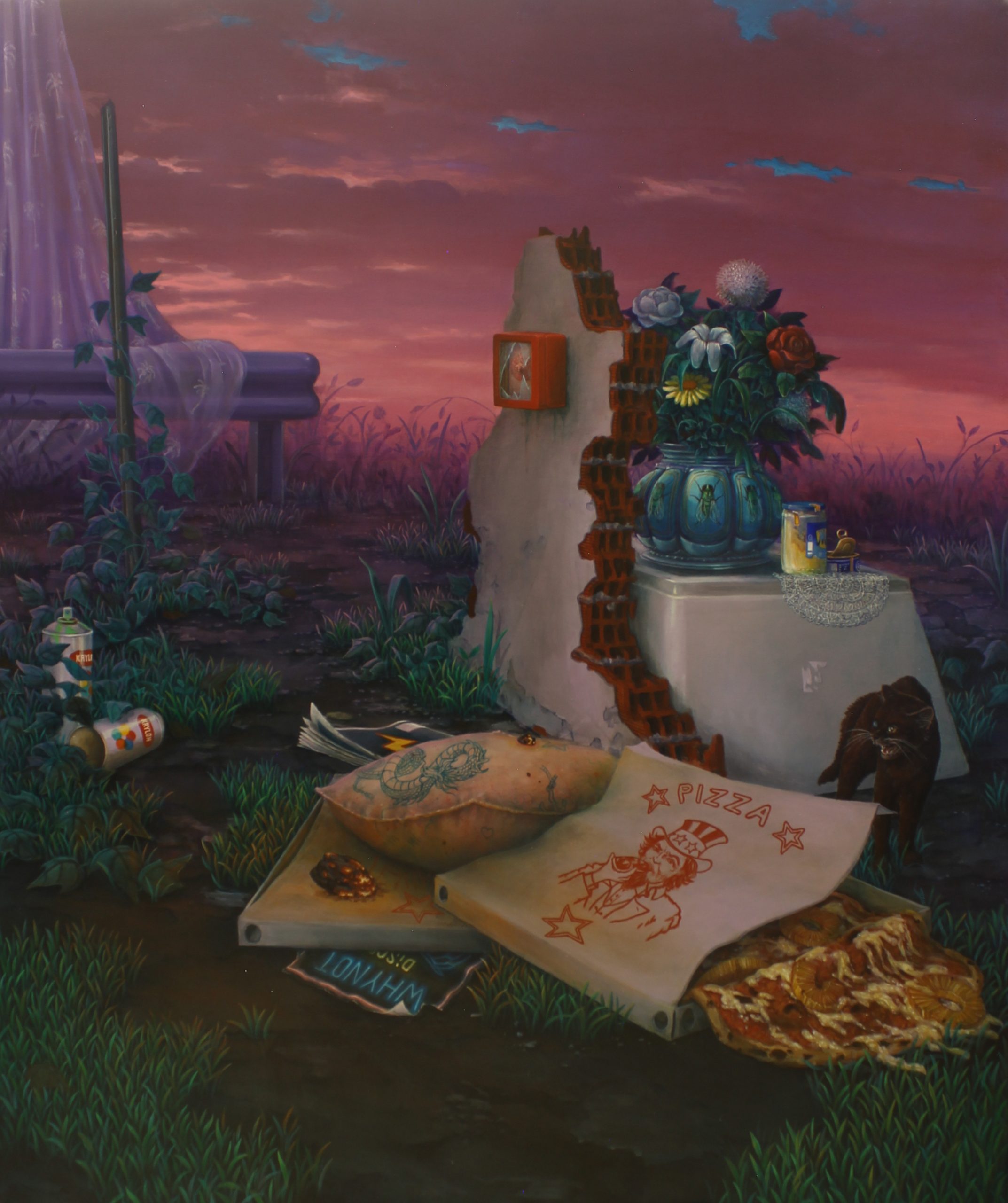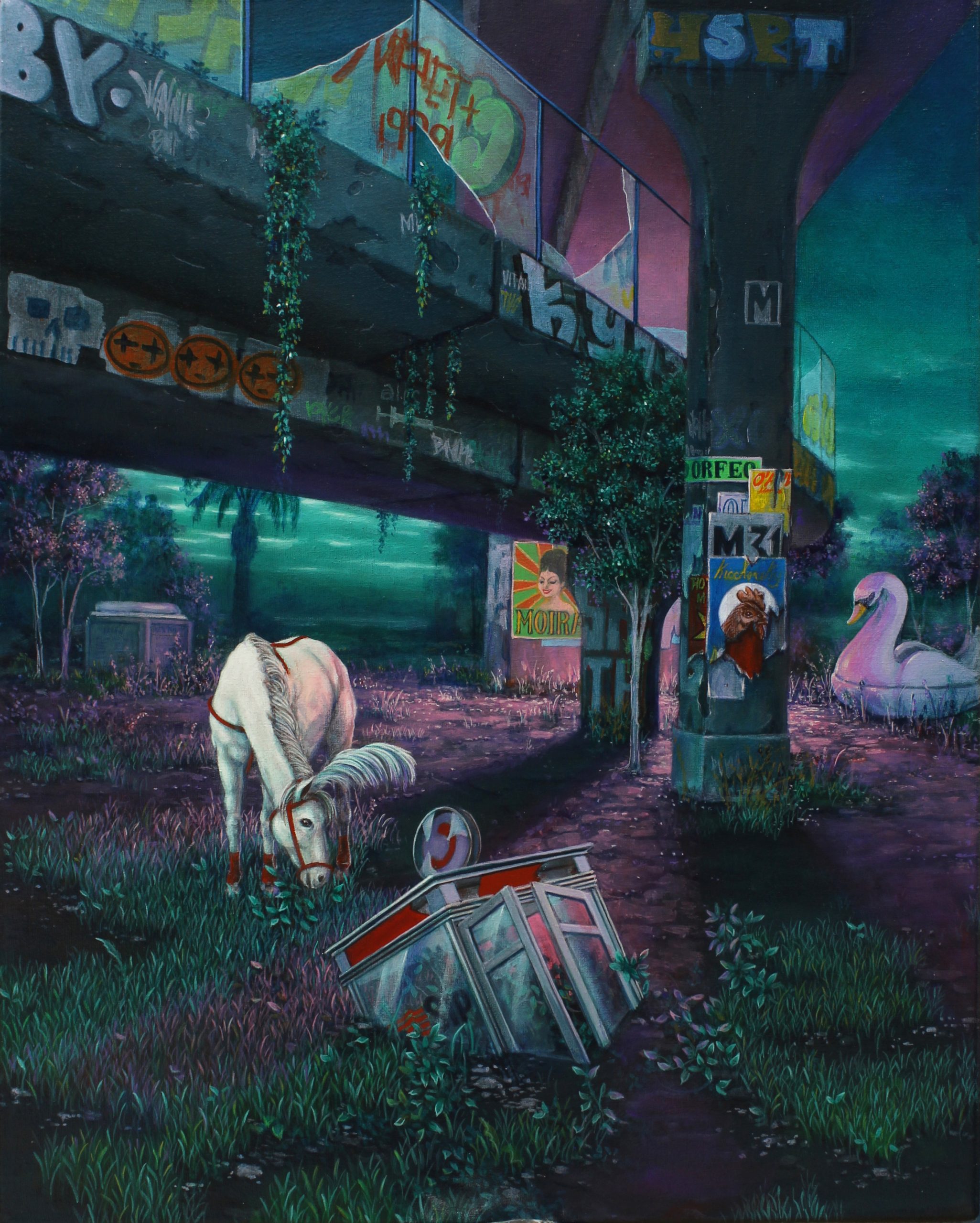 Da questo “tempo-ambiente” derivano anche le visioni dipinte da Nicola Caredda, che traduce le immagini ipnagogiche in paesaggi mentali dove si accumulano i detriti industriali, urbanistici e culturali di una civiltà estinta. Le sue sono, infatti, vedute di scenari futuri, possibili conseguenze dell’attuale impatto antropico sull’ecosistema terrestre, oppure, semplicemente, posti desolati, periferie dell’anima in bilico tra i nonluoghidi Marc Augé e gli spazi liminali[3] della nuova estetica digitale. Sono territori di confine, zone marginali che funzionano come soglie d’ingresso a una realtà alternativa, bloccata in un eterno crepuscolo che illumina, con la sua luce serotina, oggetti, suppellettili e rovine del nostro presente. Il carattere metafisico di queste periferie disabitate è scandito dal nitore realistico delle immagini, dalle perfette volumetrie dei ruderi architettonici e dalle forme finemente cesellate dei residui della società dei consumi. Sono visioni che hanno la qualità dei sogni lucidi.