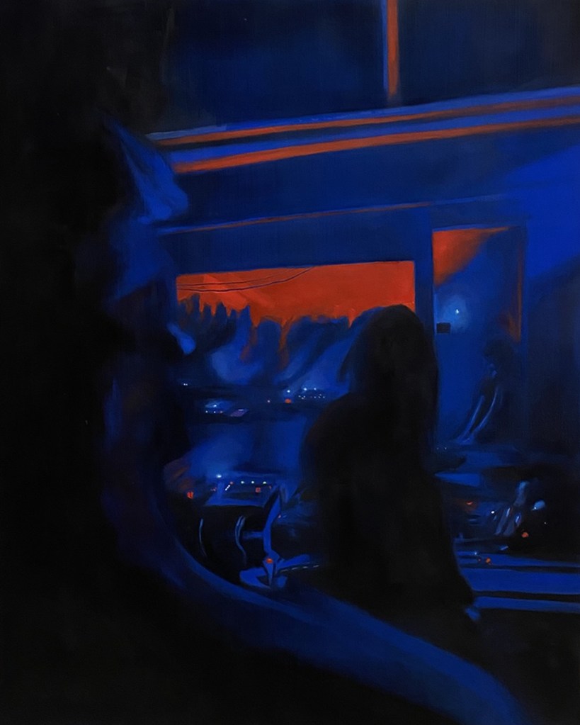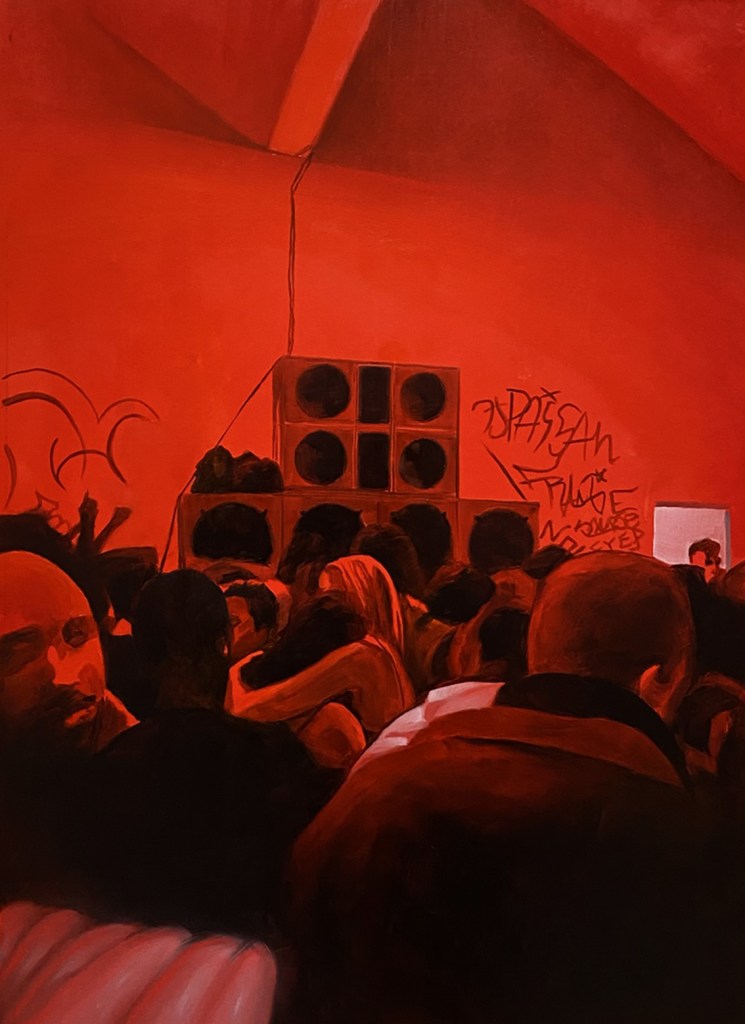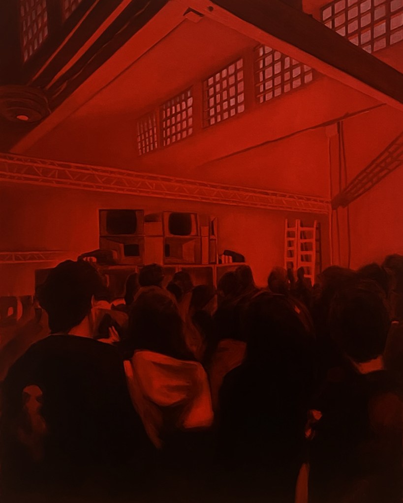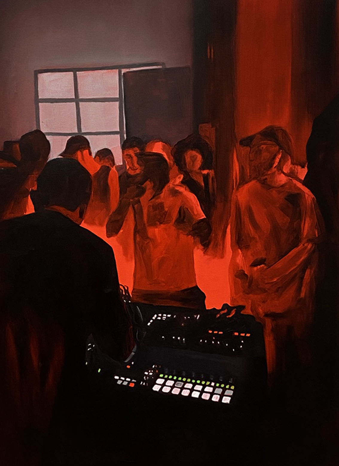 Le Blurred Frequencies a cui si riferisce il titolo della mostra non sono solo quelle della musica elettronica dove – spiega l’artista – “suoni, rumori, beat e loop si mescolano e si distorcono”, ma anche quelle di una pittura fuori fuoco, una sorta di fuzzy painting in cui forme, luci, colori collassano in visioni incerte e confuse. Allucinazioni che riflettono lo stato di trance collettiva e la sensazione di momentanea sospensione della continuità spazio-temporale. In questi nuovi Studi del buio le figure non esistono come entità isolate, ma come corpi inseriti in una fitta trama di relazioni, unità che si dissolvono in una massa corale, fluida, non gerarchica. La luce fioca e soffusa gioca un ruolo centrale, spingendo i volumi dei corpi in una dimensione incerta tra apparizione e sparizione, dove a brillare nitidamente sono solo le pulsantiere dei pannelli di controllo dei mixer, mentre tutto il resto è avvolto in una penombra da cui affiorano, come per un effetto stroboscopico, lampi d’immagini statiche.