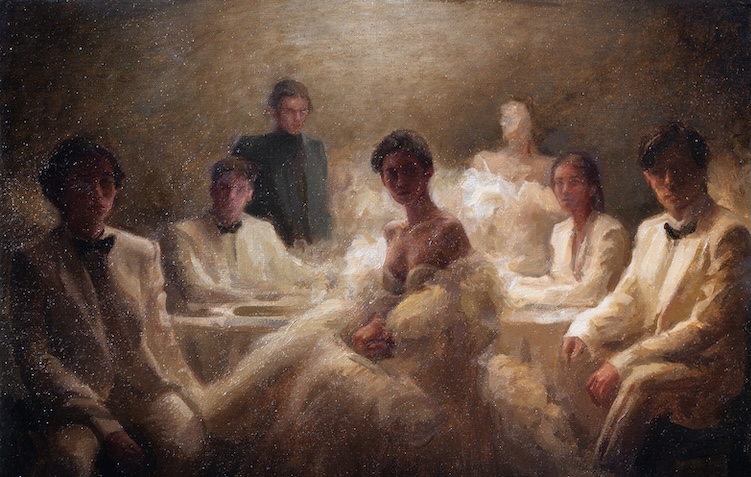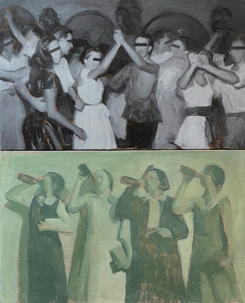 Una diversa strutturazione dell’immagine compare in Com’era bello ballare (2025), opera dal sapore postmoderno che articola la scena su due registri distinti. La zona superiore, impostata su una gamma di grigi, sembra affiorare da una lontana memoria rimossa (i personaggi hanno tutti una banda censoria sugli occhi per occultarne l’identità), mentre la parte inferiore rielabora una scena analoga con ritmo più dilatato, modulato in una timbrica verdastra che imprime una atmosfera più distesa. Una diversa strutturazione dell’immagine compare in Com’era bello ballare (2025), opera dal sapore postmoderno che articola la scena su due registri distinti. La zona superiore, impostata su una gamma lattiginosa di grigi, sembra affiorare da una lontana memoria rimossa (i personaggi hanno tutti una banda censoria sugli occhi per occultarne l’identità), mentre la parte inferiore rielabora una scena analoga con ritmo più dilatato, modulato in una timbrica verdastra che imprime una atmosfera più distesa. Le due parti generano un ritmo diseguale che enfatizza la complessa scansione temporale della narrazione.