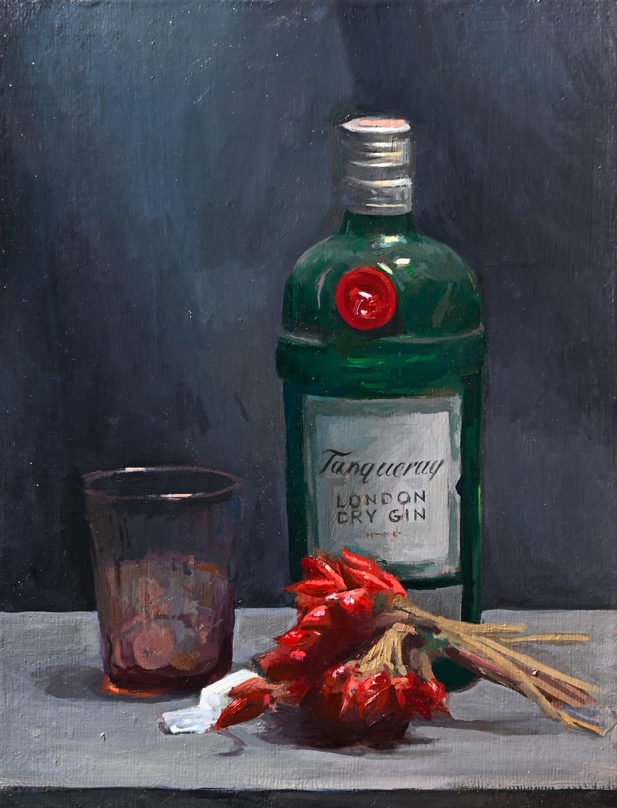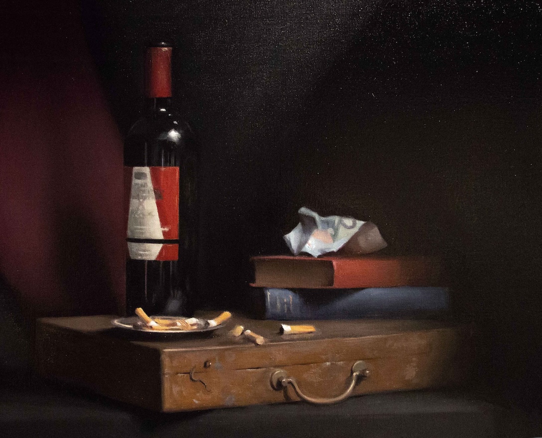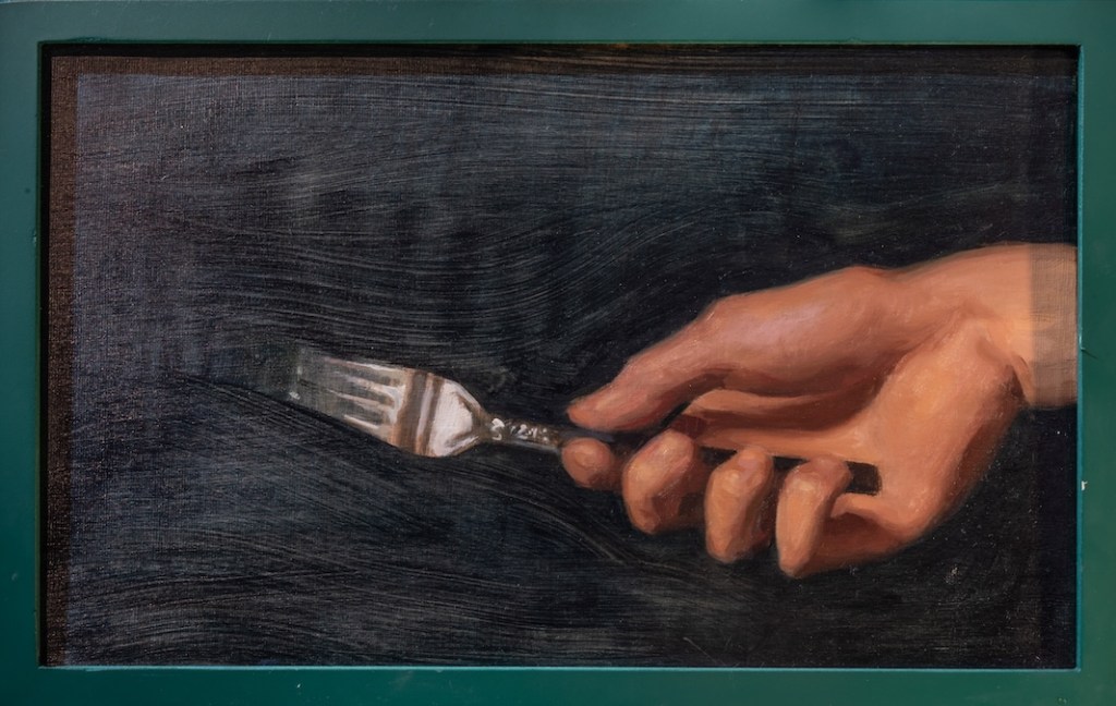 Nelle sue opere è spesso la presenza di particolari marginali e dettagli secondari ad aprire il campo percettivo e a introdurre nella scena l’irruzione del quotidiano. È una predisposizione che evidentemente emerge soprattutto nelle nature morte che catturano minuzie della dimensione più prosaica dell’esistenza. Opere come Still Alive (2019), Natura morta con caraffe (2025), Natura morta con d’acqua (2025) e Natura morta I limoni (2025) mostrano un’attenzione allenata a cogliere gli oggetti con gesti reiterati e abitudini sedimentate. Giotto Riva è un pittore interessato alla materia, capace di costruire con le texture, i volumi, i tagli di luce un racconto che trascende l’evidenza di ciò che è strettamente rappresentato su tela. Non solo la densità materica conferisce spessore agli oggetti ritratti, ma li trasforma in entità dotate di una potenza silenziosa. A questa linea appartengono, per esempio, anche dipinti come Dessert (2025) e Spicy Nights (2023) che colgono in close up particolari di una sequenza quasi filmica, che apre a molteplici possibilità interpretative.