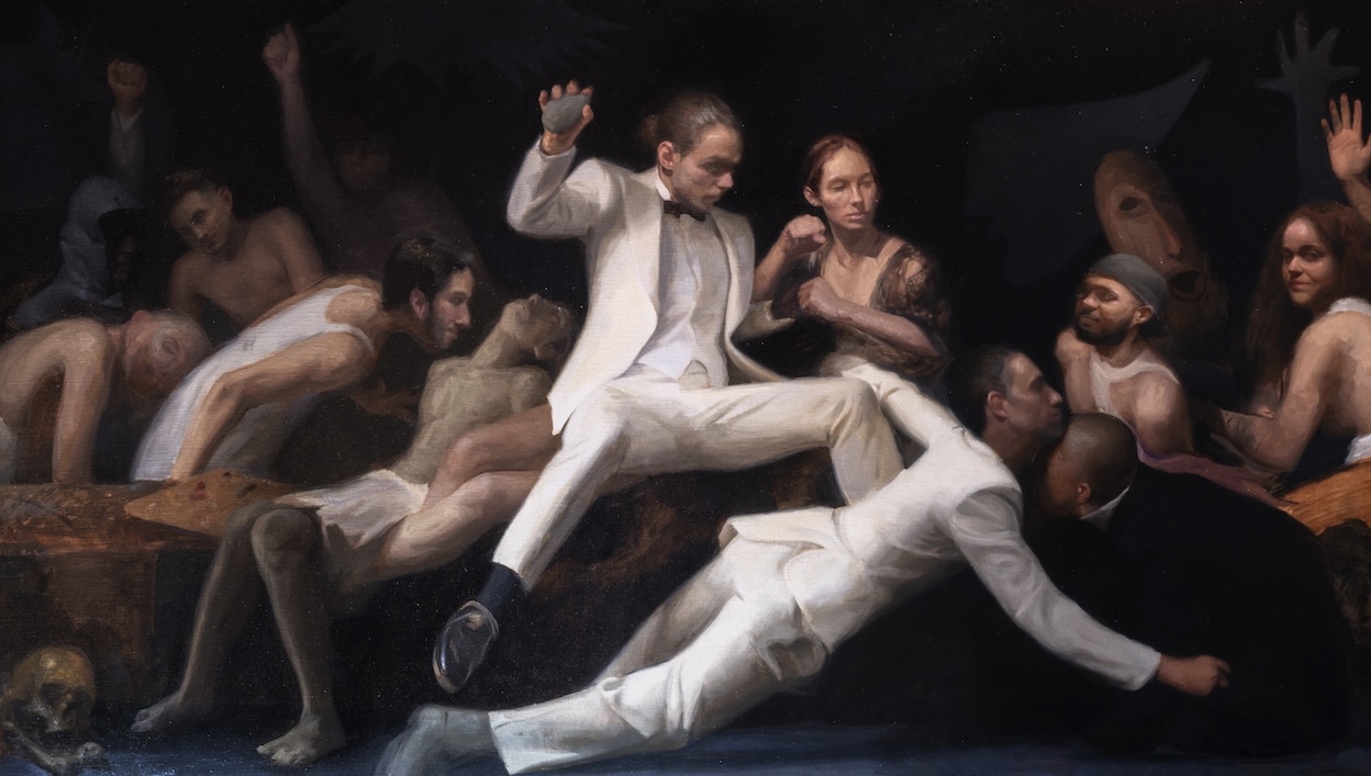 Le composizioni di scala maggiore ampliano ulteriormente questa ricerca. Un’opera corale come Il Conflitto (2025) articola l’immagine come un organismo attraversato da correnti simultanee. Le masse dei corpi, colti nella frenesia quasi orgiastica della rissa, disegnano direttrici interne che la luce orchestra in un ordinato diagramma geometrico di sapore rinascimentale. Tra i dipinti corali c’è, paradossalmente, anche la piccola tela Indulgenze (2025), dove Riva crea una composizione meno esplosiva, privilegiando un registro espressivo fatto di gesti composti e trattenuti.