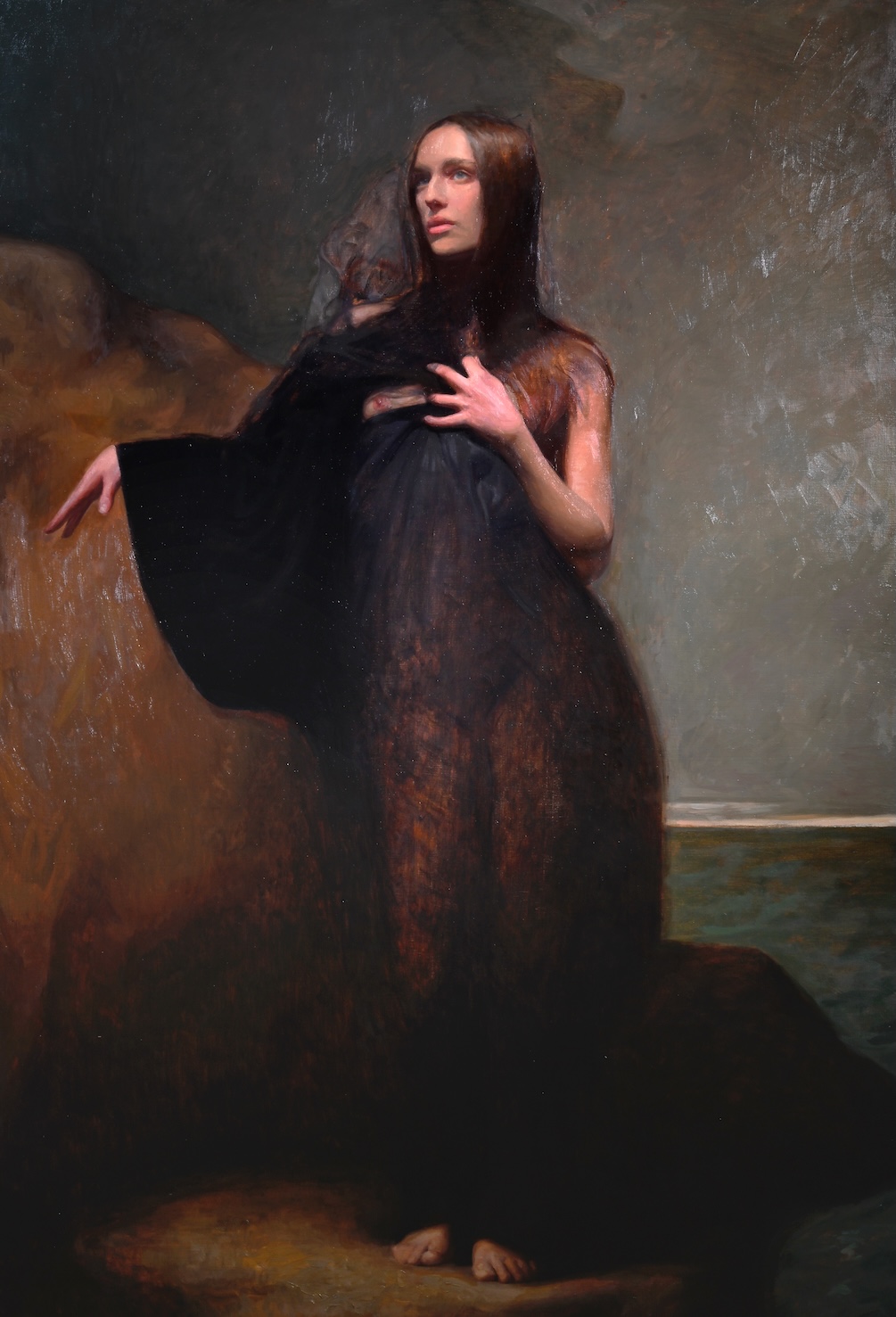 Nel grande dipinto intitolato La Notte (2025), protagonista è la personificazione femminile delle tenebre, modulata secondo i canoni della pittura simbolista e decadente nelle sembianze di una ideale femme fatale. Vengono in mente Arnold Böcklin, Puvis de Chavannes, ma anche il nostro Aristide Sartorio, quello più dannunziano. Accanto a tali lavori il Dittico del Pianto (2025) introduce un registro più intimo, in cui la pittura si distende per frammenti affettivi, schegge liriche che affiorano da lontani ricordi.