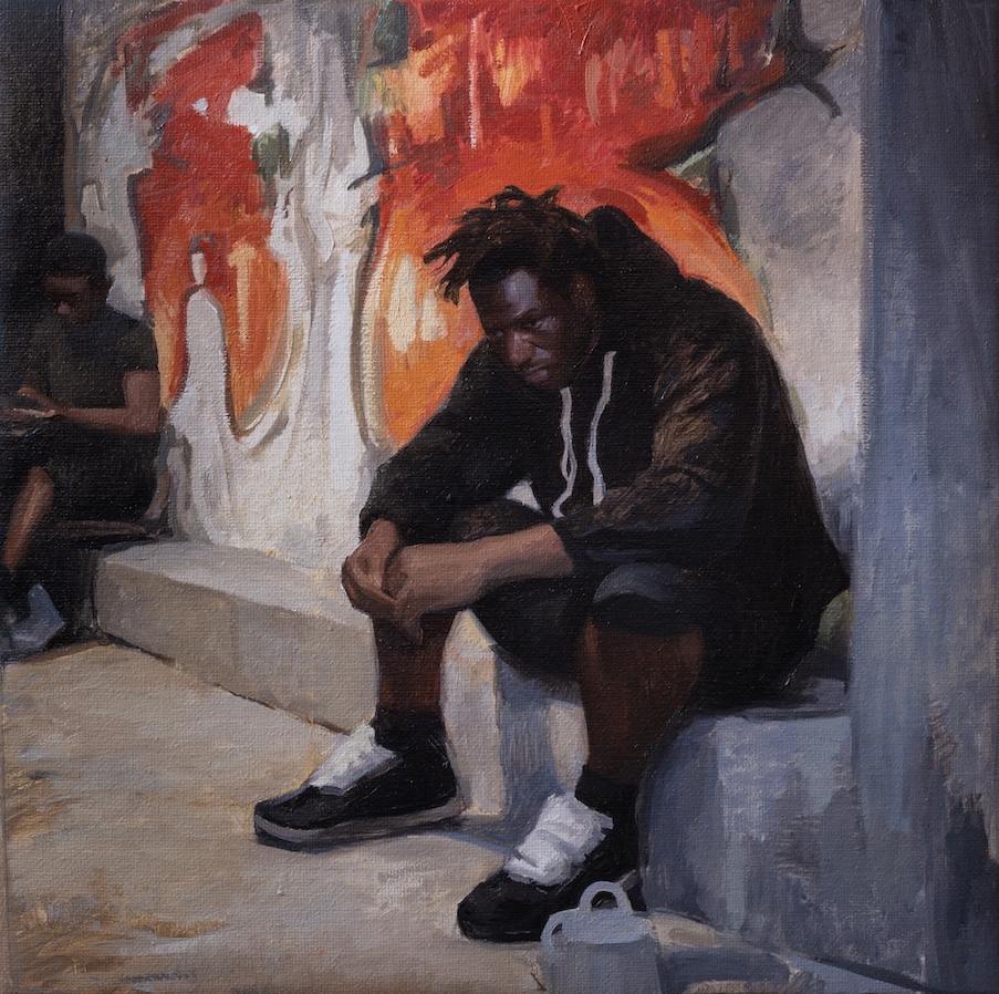 La pittura di Giotto Riva è la conseguenza di una scelta meditata, l’assunzione della figurazione quale lingua privilegiata per raccontare il presente e rappresentare realtà che altre modalità espressive trascurano, come, ad esempio, la sfera emotiva degli individui. Si tratta di una scelta di campo che permette all’artista di cogliere aspetti che costituiscono la filigrana del quotidiano, una matrice appena visibile dietro la trama superficiale delle cose. Ma catturare questi aspetti con la pittura richiede disciplina, rigore, esercizio assiduo e una predisposizione vigile verso le inflessioni più sottili dell’esperienza. In tal senso, il periodo che Giotto Riva ha trascorso a Barcellona assume un rilievo essenziale. La formazione presso la Barcelona Academy of Art, che è una scuola a forte orientamento realista, condotta sotto la guida di Jordi Díaz Alamà, gli ha permesso di sviluppare, attraverso esercizi progressivi, copie da gesso, ritratti dal vero e un lavoro preparatorio basato sulla pittura monocroma, un metodo di lavoro estremamente rigoroso. L’insegnamento ricevuto insisteva, soprattutto, sulla centralità della luce e sulla misurazione accurata dei rapporti tonali. Tale disciplina ha finito per incidere profondamente sulla pratica di Giotto Riva, che ha costruito una grammatica basata sulla tecnica ottocentesca, una preparazione fondata su una costruzione lenta e cadenzata dell’opera.