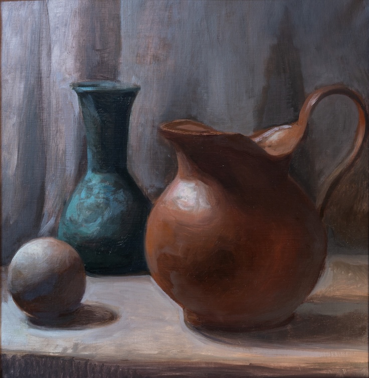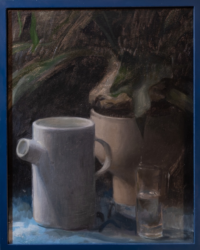 Natura Morta con Caraffe, 2025, olio su tela, 50×50 cm