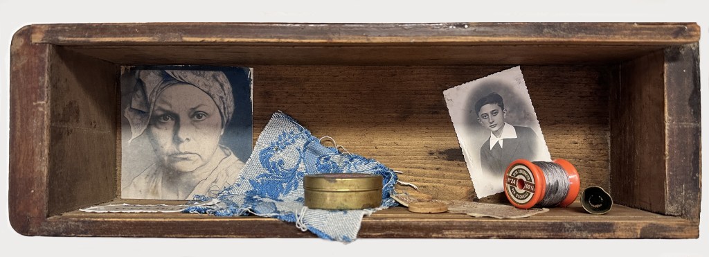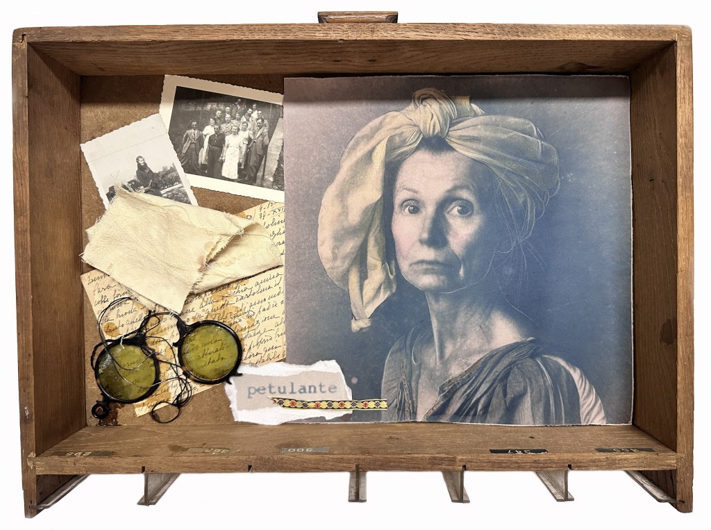 La decisione, maturata in corso d’opera, di inserire questi ritratti dentro un cassetto di legno, corredandoli con l’aggiunta di oggetti e fotografie, completa il processo di ricostruzione. I cassetti di Iotti, un po’ come le scatole di Joseph Cornell, sono scrigni della memoria, contenitori domestici e archivi in miniatura dove l’identità è associata a oggetti che l’artista raccoglie nei mercatini antiquari o in collezioni private. Sono foto d’epoca, appunti scritti con grafie incerte, ritagli di giornale, vecchi merletti consumati, frammenti di tappezzeria, monete, bottoni, santini che formano una testimonianza materiale e affettiva. All’interno del cassetto-scrigno, l’etichetta tratta dalle cartelle cliniche completa l’impianto semiotico dell’assemblaggio. Inserito accanto al volto, l’aggettivo diventa la prova della violenza perpetrata dall’apparato di potere, un sistema per disciplinare il corpo e la voce di donne “non conformi” alle aspettative del regime.