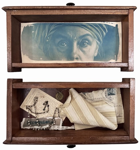 Non conforme #6 irrequieta, 2024, cianotipo tonalizzato su carta, matite colorate, oggetti vari, vecchio cassetto