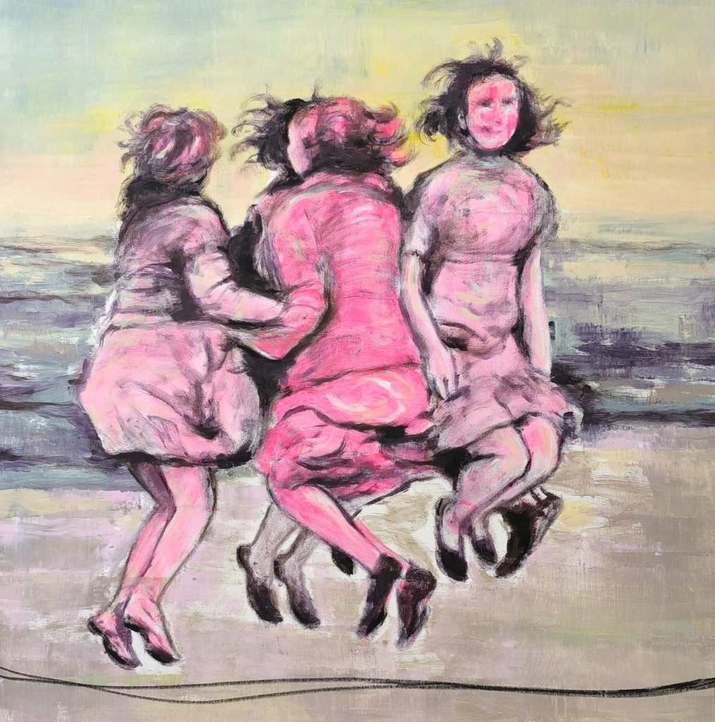 In questo senso, la pittura di Paola Geranio si presenta come una costellazione, intesa come la rappresentazione di scene corali che rendono visibile l’intreccio di energie tra i vari membri di un gruppo. Il riferimento è evidente anche sul piano formale perché il gruppo dei bambini (che saltano la corda o che fanno un girotondo) è costruito come un insieme monolitico e compatto. L’artista dipinge queste scene in acrilico e carboncino. Col primo costruisce campiture dalle tonalità accese, sovente collegate allo studio dei chakra e ai colori delle carte dei Tarocchi. Le cromie diventano, così, parte di un sistema simbolico di rappresentazione della realtà interiore, non un dato realistico, ma un indicatore dello stato energetico ed emotivo. Col carboncino, invece, l’artista traccia talvolta figure che fanno da controcanto all’immagine principale, rivelando aspetti non manifesti del personaggio o del gruppo ritratti.