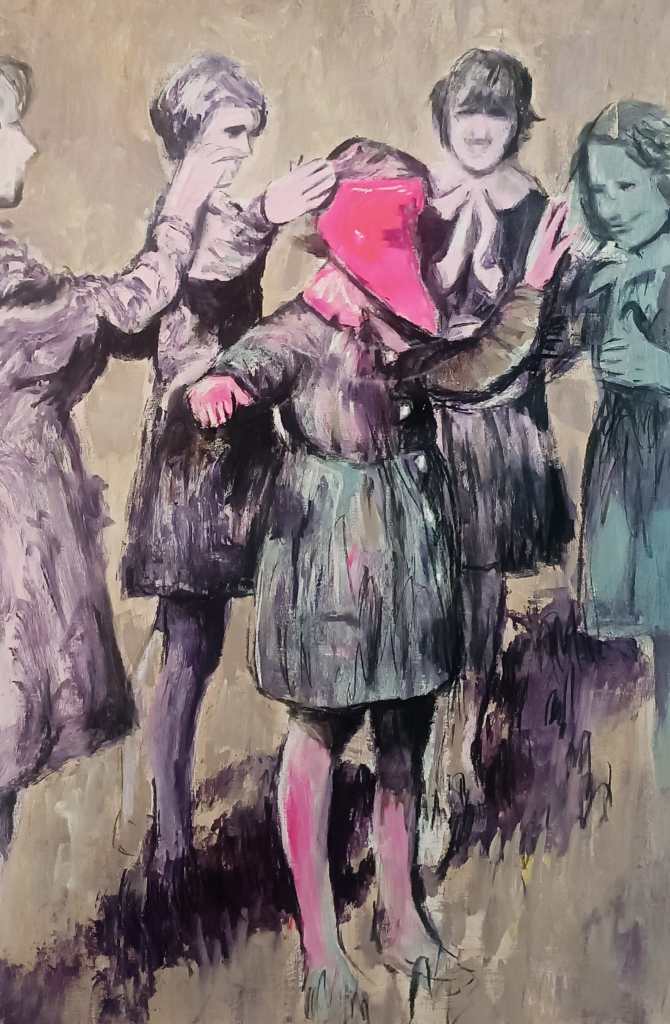 La pratica pittorica di Paola Geranio si organizza attraverso una procedura che intreccia meditazione, visualizzazioni guidate, tarologia e costellazioni familiari. La preparazione avviene tramite una centratura emotiva che consente di impostare il tono, l’intensità e il clima dell’immagine prima di iniziare la tela. L’artista usa come spunti iconografici fotografie di album familiari, concentrandosi soprattutto su immagini che mostrano i giochi dell’infanzia, in cui riconosce una sorta di “spazio parallelo”, un luogo dove i bambini stabiliscono regole. Paola Geranio lega queste attività ludiche alla grammatica delle costellazioni familiari sistemiche formulate da Bert Hellinger, uno strumento esperienziale orientato a far emergere dinamiche nascoste del sistema di origine. A interessarla, è la disposizione e la relazione dei corpi nello spazio, i movimenti e le posizioni che questi assumono, trasformando ogni scena in una sorta di mappa affettiva. Da qui nasce la scelta di usare la pittura come un sistema linguistico che converte l’iniziale spunto fotografico in immagini capaci di restituire la carica emotiva del gesto e restituirla in una forma aperta e leggibile.