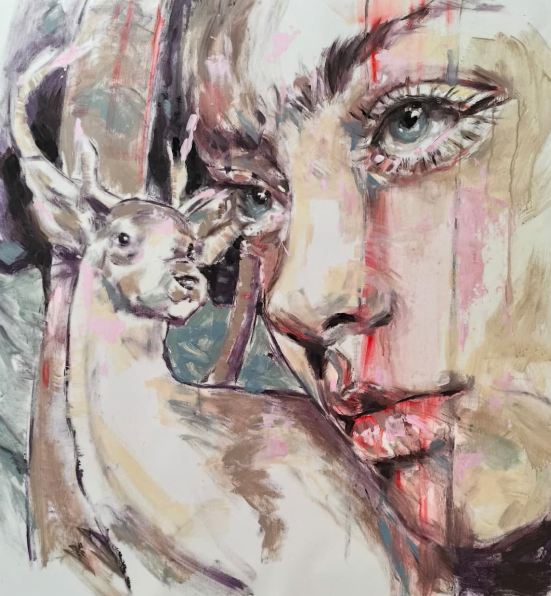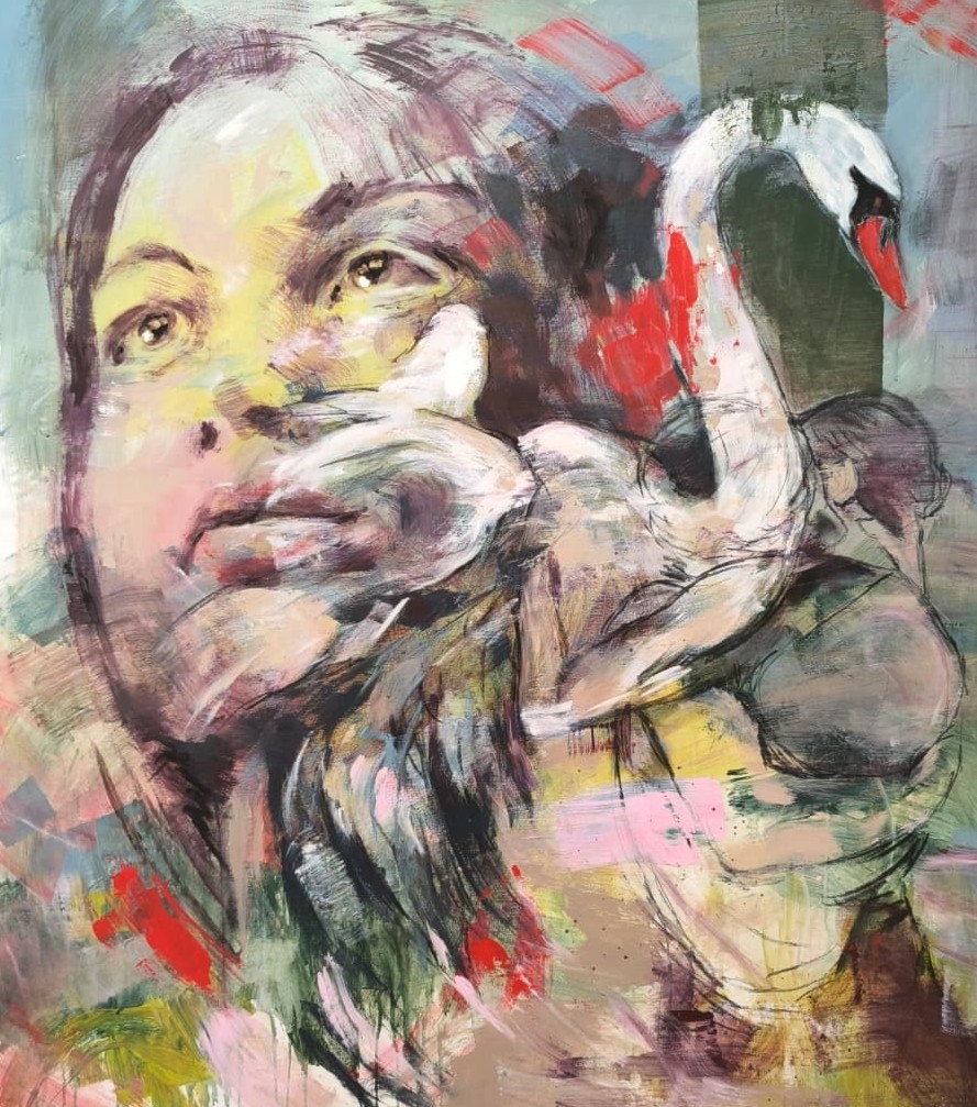 Accanto alle scene di gruppo, i ritratti declinano il tema delle costellazioni concentrandosi sulla fisionomia. Qui ogni volto è accompagnato da un animale guida, un daimon, che rappresenta la parte più intima e nascosta del sé, funzionando come un totem personale. È il caso di lavori come I Fall, Toward the Light(2026), Constellation 013 (2025), Constellation 014 (2025) e La Ghianda (2025), dove l’interpolazione tra i lineamenti umani e il bestiario simbolico (fenicotteri, cavalli, cigni e cervi) condensa i tratti psicologici dell’individuo.