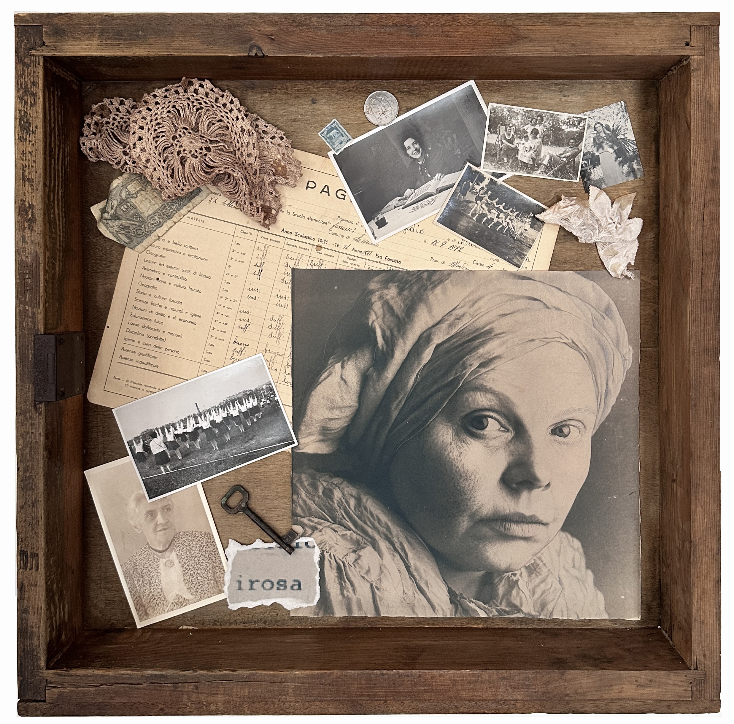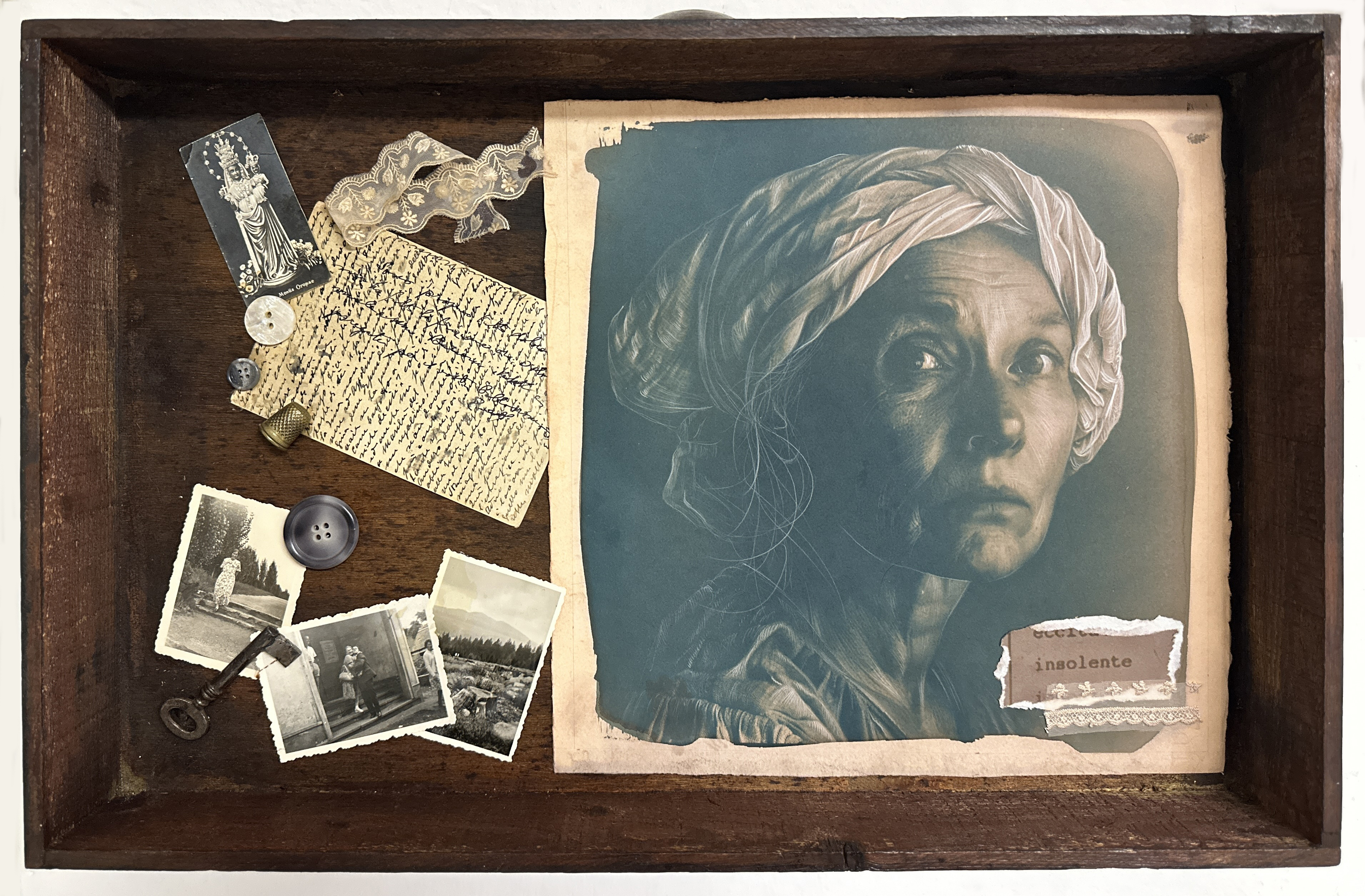 La decisione, maturata in corso d’opera, di inserire questi ritratti dentro un cassetto di legno, corredandoli con l’aggiunta di oggetti e fotografie, completa il processo di ricostruzione. I cassetti di Iotti, un po’ come le scatole di Joseph Cornell, sono scrigni della memoria, contenitori domestici e archivi in miniatura dove l’identità è associata a oggetti che l’artista raccoglie nei mercatini antiquari o in collezioni private. Sono foto d’epoca, appunti scritti con grafie incerte, ritagli di giornale, vecchi merletti consumati, frammenti di tappezzeria, monete, bottoni, santini che formano una testimonianza materiale e affettiva. All’interno del cassetto-scrigno, l’etichetta tratta dalle cartelle cliniche completa l’impianto semiotico dell’assemblaggio. Inserito accanto al volto, l’aggettivo diventa la prova della violenza perpetrata dall’apparato di potere, un sistema per disciplinare il corpo e la voce di donne “non conformi” alle aspettative del regime.