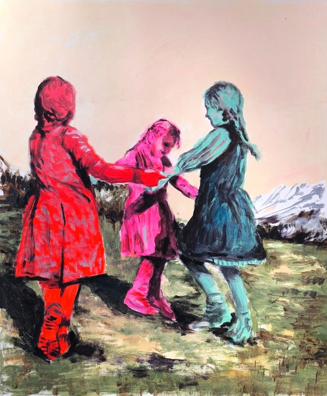 La pratica pittorica di Paola Geranio si organizza attraverso una procedura che intreccia meditazione, visualizzazioni guidate, tarologia e costellazioni familiari. La preparazione avviene tramite una centratura emotiva che consente di impostare il tono, l’intensità e il clima dell’immagine prima di iniziare la tela. L’artista usa come spunti iconografici fotografie di album familiari, concentrandosi soprattutto su immagini che mostrano i giochi dell’infanzia, in cui riconosce una sorta di “spazio parallelo”, un luogo dove i bambini stabiliscono regole. Paola Geranio lega queste attività ludiche alla grammatica delle costellazioni familiari sistemiche formulate da Bert Hellinger, uno strumento esperienziale orientato a far emergere dinamiche nascoste del sistema di origine. A interessarla, è la disposizione e la relazione dei corpi nello spazio, i movimenti e le posizioni che questi assumono, trasformando ogni scena in una sorta di mappa affettiva. Da qui nasce la scelta di usare la pittura come un sistema linguistico che converte l’iniziale spunto fotografico in immagini capaci di restituire la carica emotiva del gesto e restituirla in una forma aperta e leggibile.