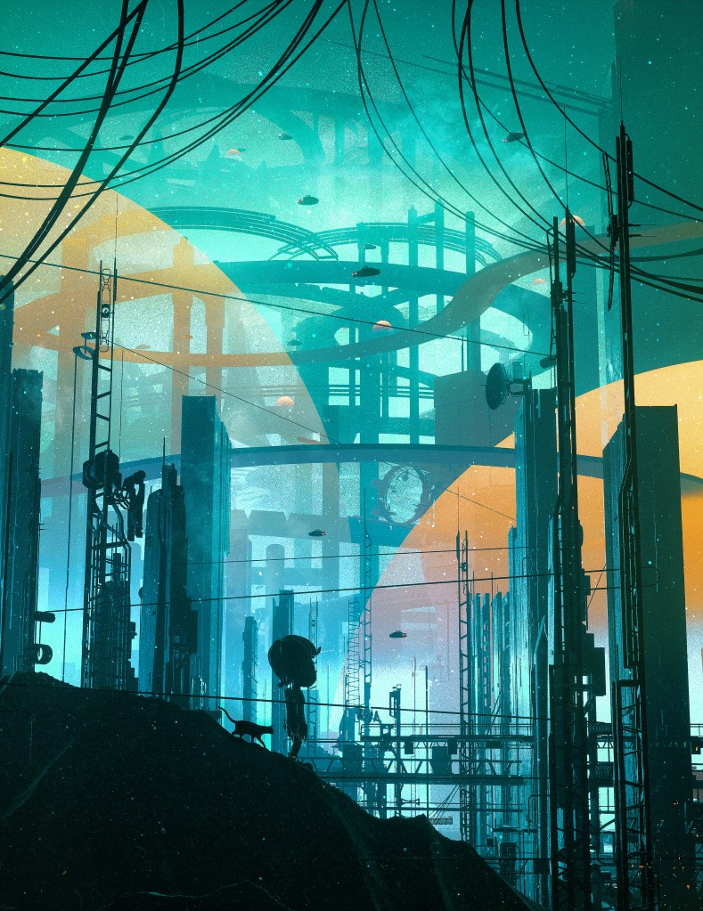 Nato in Francia nel 1971, ma residente a Montreal dal 2002, Raphaël Lacoste ha lavorato nel mondo dei videogame come art director dei franchise Prince of Persiae Assassin’s Creed, e poi nell’industria cinematografica in qualità di Concept Artist, Production Designer e Matt Painter in film come Terminator Salvation (2009), Journey to the Center of the Earth (2008), Death Race (2008), Repo Men (2010), Immortals (2011) e Jupiter Ascending (2015). Nel suo universo visivo il paesaggio ha un ruolo centrale. Influenzato dalla fantascienza e dal cyberpunk, ma anche da pittori romantici come Caspar David Friedrich e Albert Bierstadt e da fotografi contemporanei come Greg Girard e Gregory Crewdson, Lacoste ha creato l’immaginario di un futuro ipertecnologico dove immensi edifici verticali, simili a nuove cattedrali gotiche, sorgono accanto a scenari naturalistici incontaminati. Come nella serie AI Metropolis, che rappresenta le vicende di un gruppo di esploratori al confine tra i territori selvaggi e gli immensi conglomerati urbani. In questo connubio tra mondo naturale e civiltà avanzata, Lacoste ha scoperto un nuovo senso del sublime. Non più il sentimento kantiano di sgomento generato dalla visione delle forze distruttive della natura, quello delle tempeste di William Turner o del Wanderer above the Sea of Fog di Friedrich, ma quello che proviamo davanti allo smisurato sviluppo della tecnologia umana e dei suoi artefatti: un sublime per l’era dell’Antropocene.