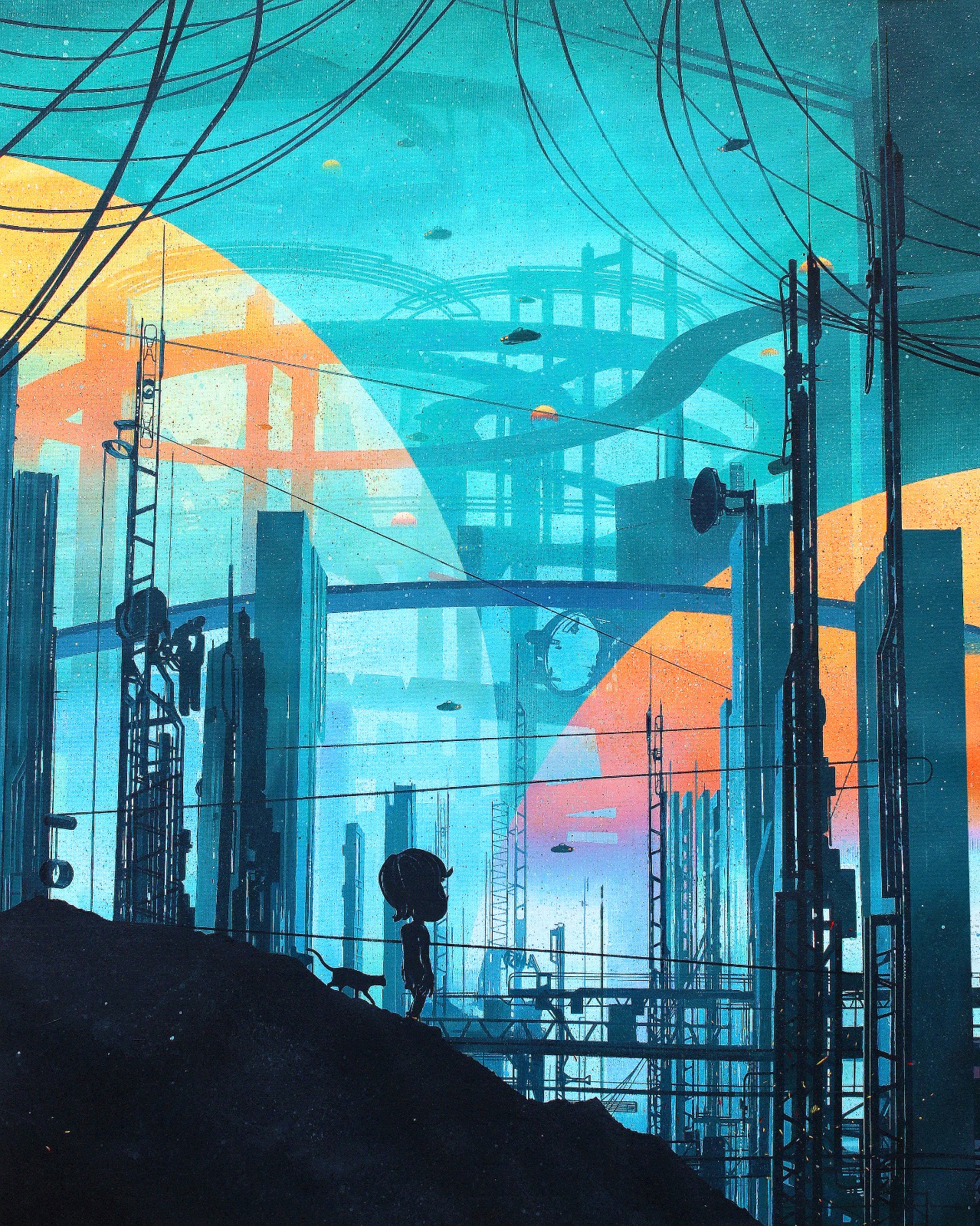 Nato a Torino nel 1995, Leopoldo D’Angelo, meglio conosciuto col nome di Dangiuz, appartiene a una generazione che si è nutrita delle subculture della rete ed è stata influenzata dalla diffusione online di generi estetici e musicali, come ad esempio la Synthwave e l’Outrun. Questi elementi hanno, infatti, contribuito alla definizione del suo stile, soprattutto nei riferimenti visivi alla fantascienza degli anni Ottanta e Novanta. Le sue visioni sono ambientate in una notturna congerie urbana, illuminata da ologrammi e scariche incandescenti di neon, scenario di un futuro prossimo più che plausibile. Dangiuz ci catapulta, infatti, nella dura realtà del Conglomerato, lo Sprawl del William Gibson di Count Zero (1986) o la Neo-Tokyo immaginata da Katsuhiro Otomo in Akira (1988), un agghiacciante incubo verticale di sopraelevate e grattacieli collegati da ponti sospesi, affacciati su un’abissale giungla di livelli stradali. È, infatti, in una megalopoli che ricorda la Los Angeles di Rick Dekard che si ambientano le sue storie. I suoi personaggi, buie silhouette stagliate sui lampi intermittenti della metastasi urbana, abitano una realtà che incarna tutti gli squilibri del tardo-capitalismo: dalle feroci disuguaglianze sociali dell’economia globale all’immane catastrofe ecologica, dalla polverizzazione del patto sociale al controllo delle multinazionali, dalla connettività post-umana dei servo-meccanismi alla claustrale solitudine dell’individuo isolato nella propria cellula abitativa. È un mondo che cade a pezzi, un universo cyberpunk che recentemente si è evoluto in una nuova dimensione estetica, iniziata con l’opera Wasteland, la descrizione di un mondo di carcasse in rovina.