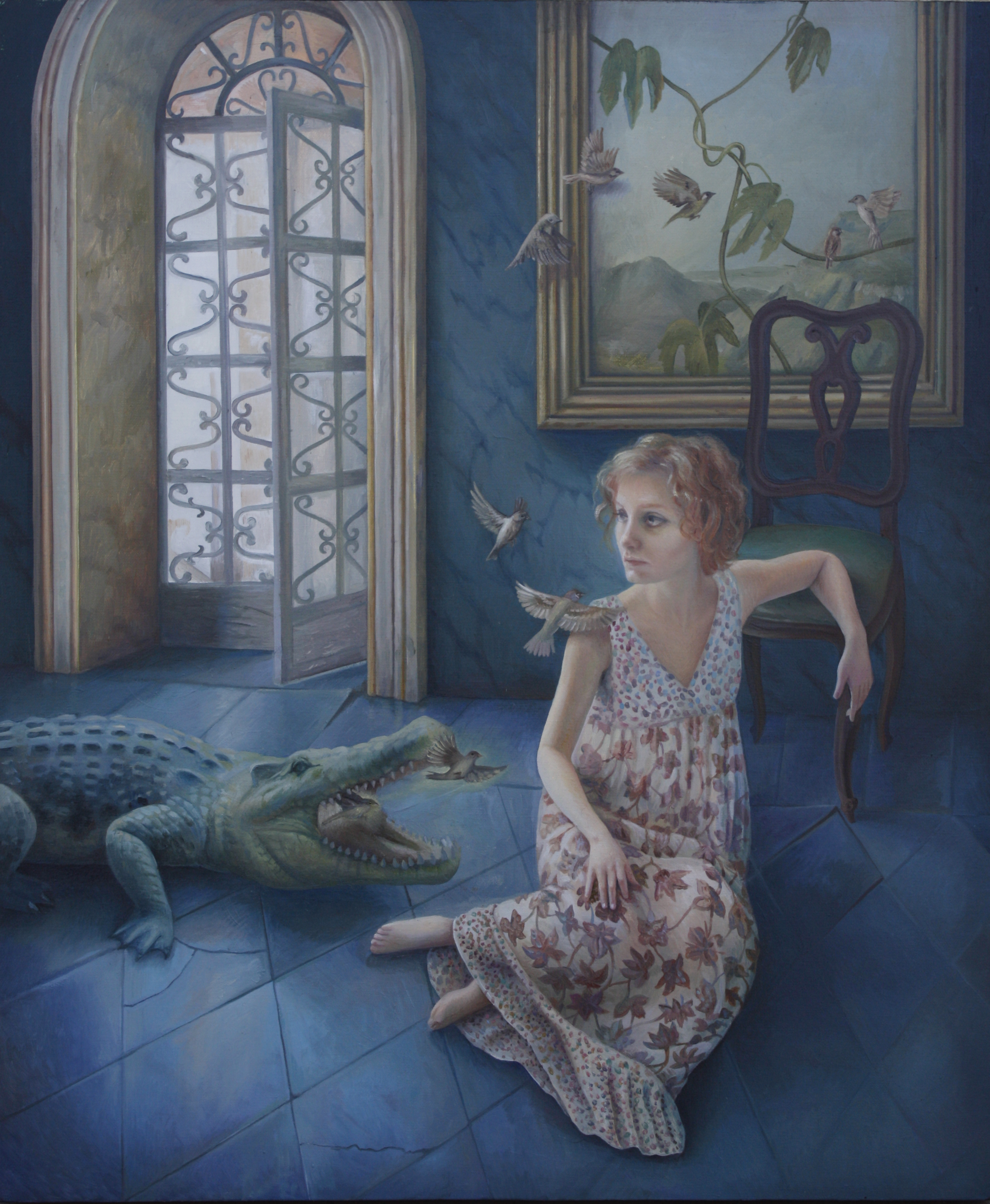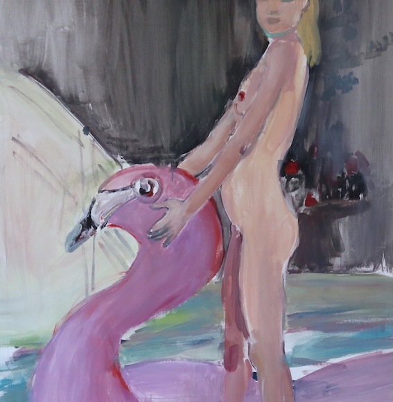 Nel dipinto La piscina delle donne, Milena Sgambato reinterpreta il mito classico di Leda e il cigno e, allo stesso tempo, evoca la simbologia acquatica come elemento di archetipico di trasformazione e conoscenza, collegando il corpo femminile a quella dimensione di fluidità, evocata anche nella qualità liquida della sua pittura.