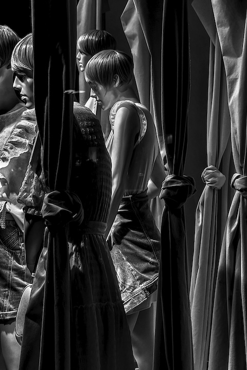 Infine, Dietro le quinte, la fotografia di Carlo Silva, affronta il tema del perturbante attraverso la visione dei manichini che attendono silenziosi nel retro di un negozio. Sono simulacri ambigui, effigi ingannevoli che Silva usa come paradigmi per rimarcare differenza la mimesi illusoria di un’anatomia artificiale e l’ineludibile verità del corpo organico.