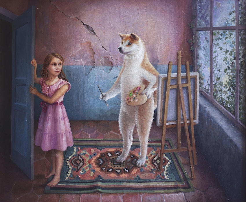 In Japanese Master Ilaria Del Monte rilegge, con piglio ironico e surreale, l’iconografia classica del “pittore con la modella”. Nel suo dipinto, infatti, uno Shiba Inu, un tipo di cane giapponese (lo stesso posseduto dall’artista), sta eseguendo il ritratto di una giovane ragazza, la quale, improvvisamente, decide di defilarsi, abbandonando l’estenuante seduta di posa per avventurarsi nel mondo.