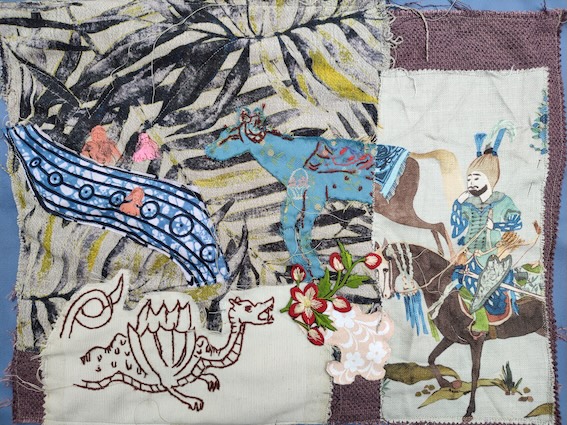 La materialità diventa racconto nelle tessiture di Loredana Galante, che con Il drago sputa fiori ricorre a una pratica tradizionalmente femminile, quella del ricamo, per costruire un’immagine fiabesca, composta da molteplici stratificazioni che impongono una fruizione lenta e meditata.