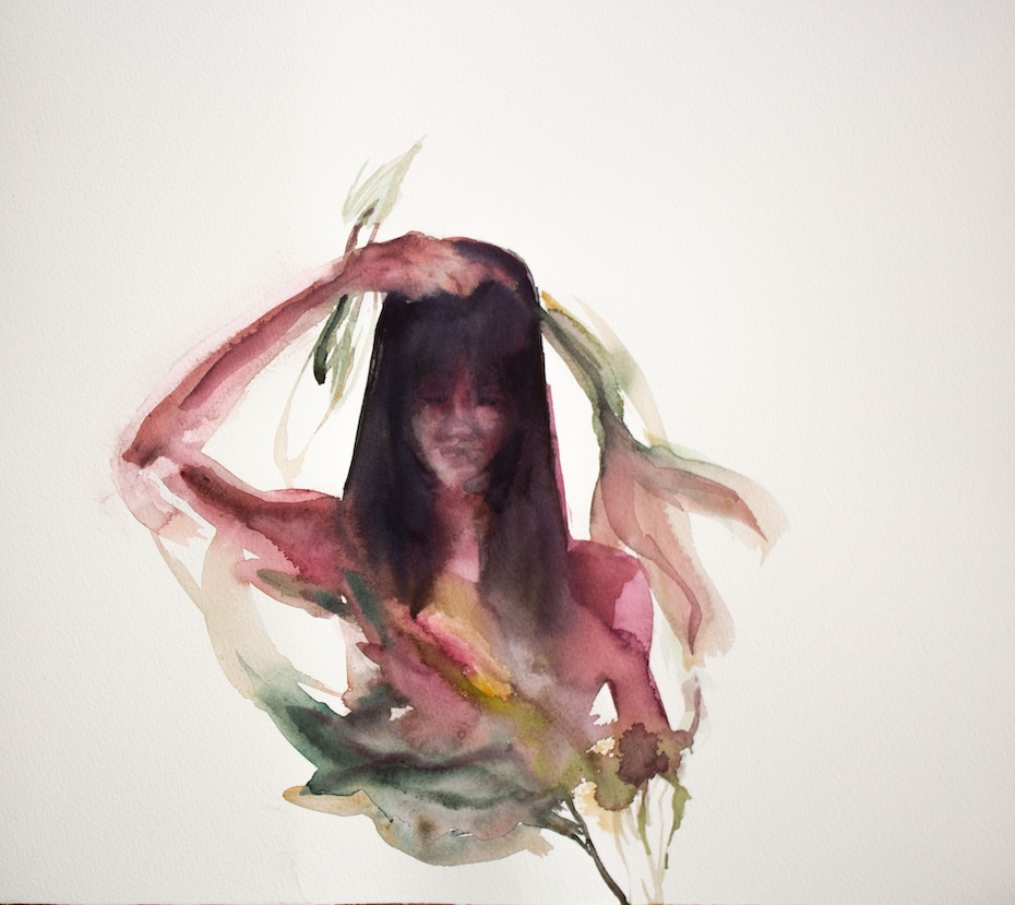 Tematiche legate al rapporto tra uomo e ecosistema emergono anche nel dipinto Naturae di Ersilia Sarrecchia, che rappresenta spesso il corpo femminile come metafora della potenza generativa della natura. Una visione più metamorfica è, invece, quella proposta da Grazia Salierno, che nell’acquerello Mimetismo fanérico[5], mostra una figura femminile che si dissolve nello spazio, in un processo che è, insieme, di fusione e disgregazione.