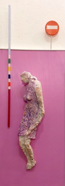 Di natura più politica è l’arte di Pierluigi Cocchi, che in Donna Prigioniera, una pittoscultura articolata tra la superficie dipinta e la volumetria del soggetto modellato in terracotta, affronta la difficile relazione tra corpo femminile e ambiente urbano, percepito come elemento di un’architettura sociale repressiva e coercitiva.