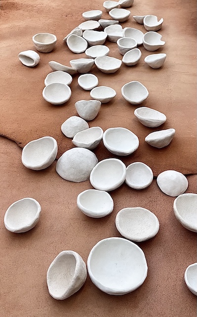 L’installazione site-specific di Rita Bagnoli, dal titolo Preghiere, trasforma una moltitudine di ciotole di biscuit in oggetti di meditazione. L’opera esplora il tema della ricerca interiore, creando una dimensione intima in cui la ceramica diventa il mezzo per articolare un dialogo con il tempo vissuto. La materia, così plasmata dall’esperienza, trasforma la pratica artistica in un rituale contemplativo.