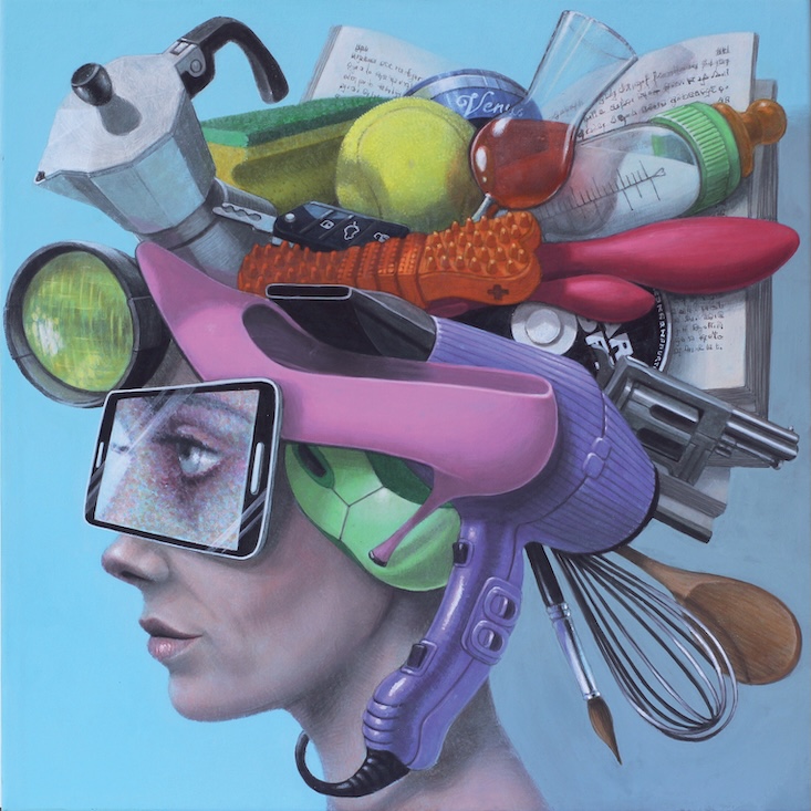 Elisa Cella allude all’archetipo femminile in maniera indiretta, attraverso un segno ripetuto, un cerchio che evoca le strutture molecolari, ma suggerisce anche un legame tra macrocosmo e microcosmo. In 17-C06, il pattern, ovvero lo schema grafico dell’opera, rimanda ai ricami di pizzi e merletti, prodotti di un artigianato femminile capace di tradurre in motivi ornamentali la complessa trama della natura e dell’universo. Nell’opera intitolata Oggettiva-Mente, Vania Elettra Tam ridefinisce l’ideale femminile mostrando il profilo di una donna con il capo ricoperto di oggetti di ogni tipo. Sono utensili, dispositivi, strumenti e accessori che simboleggiano, come afferma l’artista, “la versatilità e complessità” di una figura irriducibile a ogni tentativo di semplificazione.