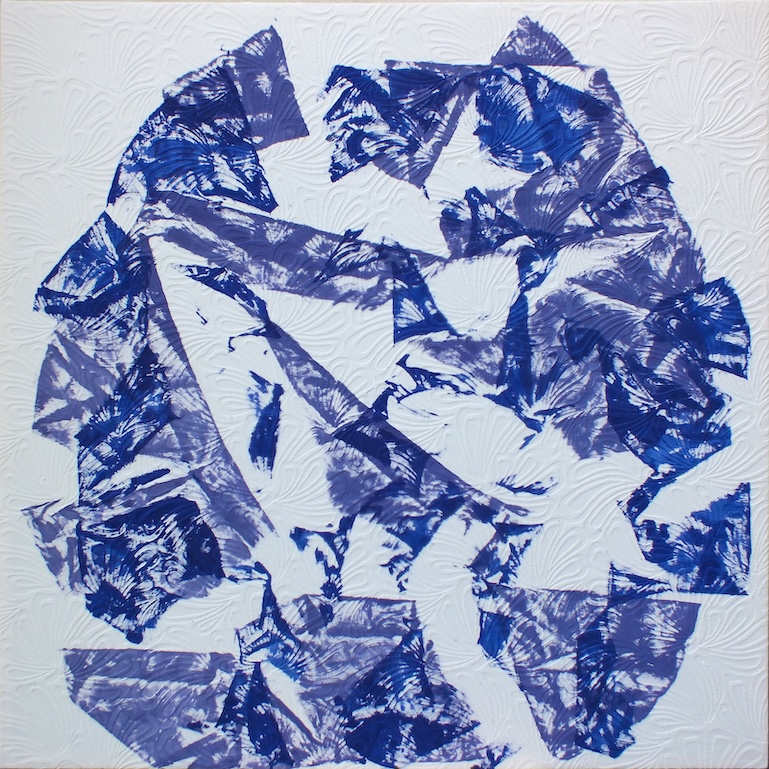 In L’immensità nel puntino, Valeria Angelini riduce l’immagine alla sua massima essenza: un punto bianco su uno sfondo multiforme. Questo segno minimo, immerso e quasi occultato nella trama cromatica dell’opera, diventa allegoria della dimensione intima e silenziosa del principio femminile, una forza che anima l’eterno ciclo rigenerativo della vita.