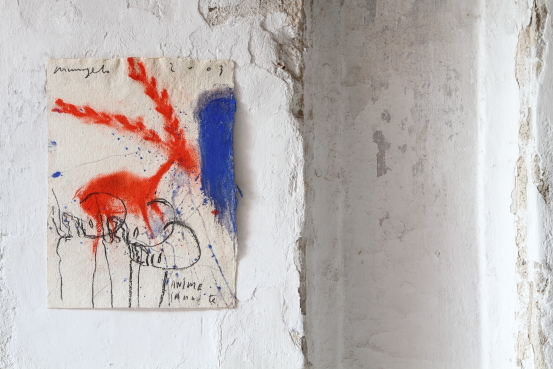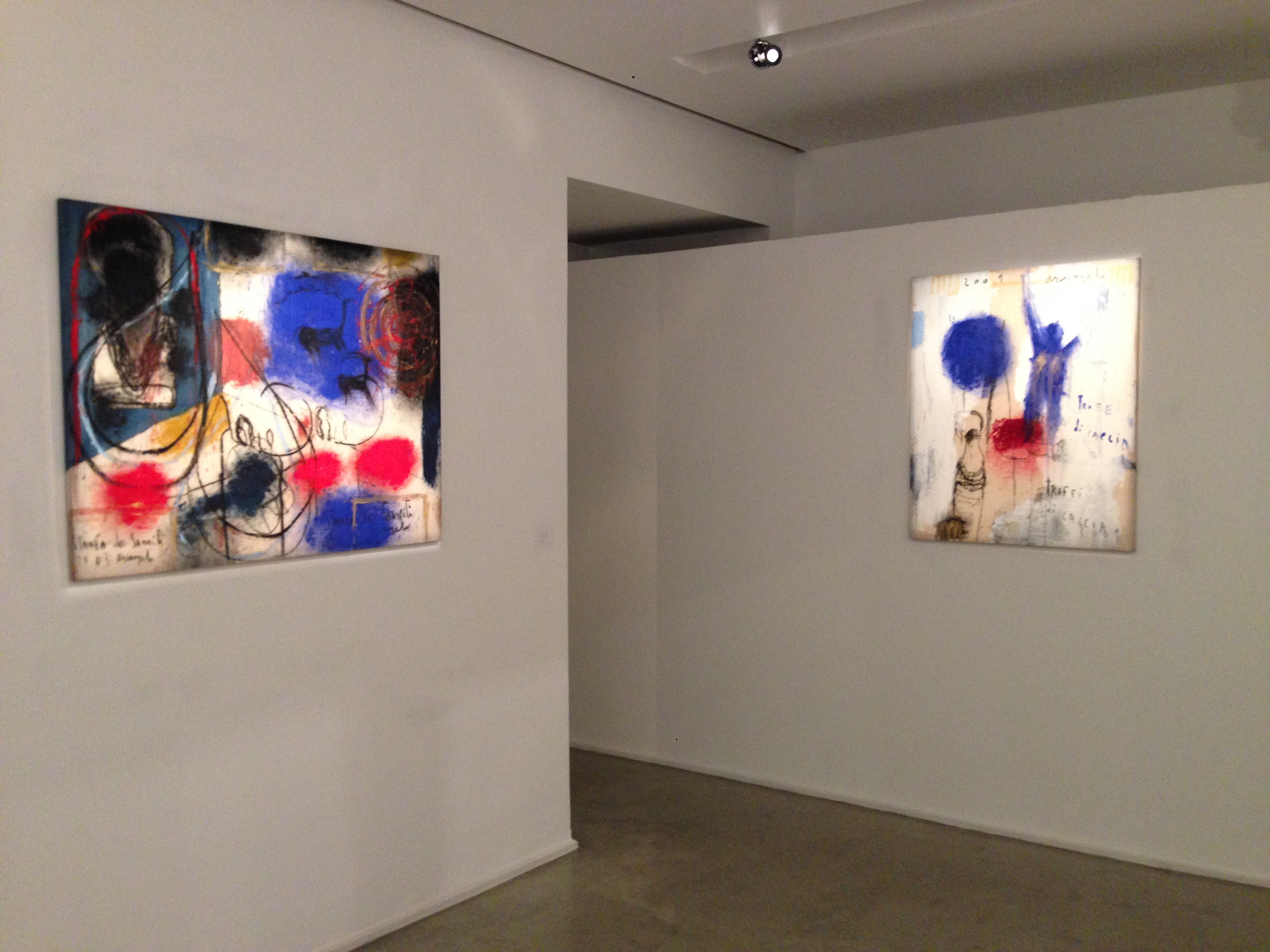 Questa mostra raccoglie opere su carta che forniscono una testimonianza preziosa dell’avvicendarsi dei cicli dagli anni Ottanta ad oggi: dal Terra mia ai Pianeti, dai Dogon alle Stanze dei Misteri, da Verso Oriente ai Tappeti Persiani, dai Sanniti ai Feticci, fino ai Segou, alle Case e ai più recenti Ex Voto. Il titolo della rassegna, Da Terra mia, evidenzia come quella prima serie di lavori non sia, per ammissione stessa dell’artista, “un ciclo che, spiritualmente, possa avere una conclusione, perché tratta temi che ritornano sempre come specificità caratteriali”. E, di fatto, le intuizioni germinali di Terra mia ritorneranno anche nelle opere successive al 1988, anno in cui Arcangelo passa ad una nuova fase creativa, contraddistinta da un ampliamento della tavolozza cromatica e da una visione più aperta e aerea. Fino al 1994, infatti, l’artista lavorerà alla serie dei Pianeti, dove il tema della Terra viene trasposto in una dimensione ultramondana venata di lirismo e, soprattutto, dove l’utilizzo della scrittura diventa elemento grafico pregnante, in stretto dialogo con l’impronta gestuale delle opere precedenti. Sono visioni costellate di forme circolari e fluttuanti, cosmologie che si sostituiscono alle morfologie terrestri e che rompono il rigore monocromatico. Arcangelo scopre la corrispondenza tra la terra e il cielo, dislocando le intuizioni del primo periodo in uno spazio virtualmente più ampio. In seguito ad un viaggio intrapreso in Africa nell’inverno del 1990, si interessa alle tradizioni tribali delle civiltà del Delta del Niger e, così, nascono i cicli dedicati ai Dogon e ai Lobi. Sono carte cosparse di figure totemiche e falliche, stagliate su fondali di un blu intenso. Il critico tedesco Andrea Jahn rileva subito che l’attenzione di Arcangelo per l’arte dei Dogon “è un segno del suo interesse verso fenomeni multiculturali e internazionali oltre che della sua diffidenza nell’atteggiamento fondamentalmente positivistico del pensiero occidentale” . Nonostante il cambio di soggetto iconografico, Arcangelo continua a ricercare un’adesione profonda, quasi fisica con i temi trattati. La spiritualità e il senso del sacro sono filtrati da uno stile ad alto gradiente emotivo, che nulla concede alla rappresentazione simbolica ed erudita. Arcangelo dipinge ombre spettrali, esili incubi, figure ibride e magmatiche che in seguito si trasformeranno nelle inquietanti forme dei battenti, ispirate ai suggestivi Misteri settennali di Guardia Sanframondi.