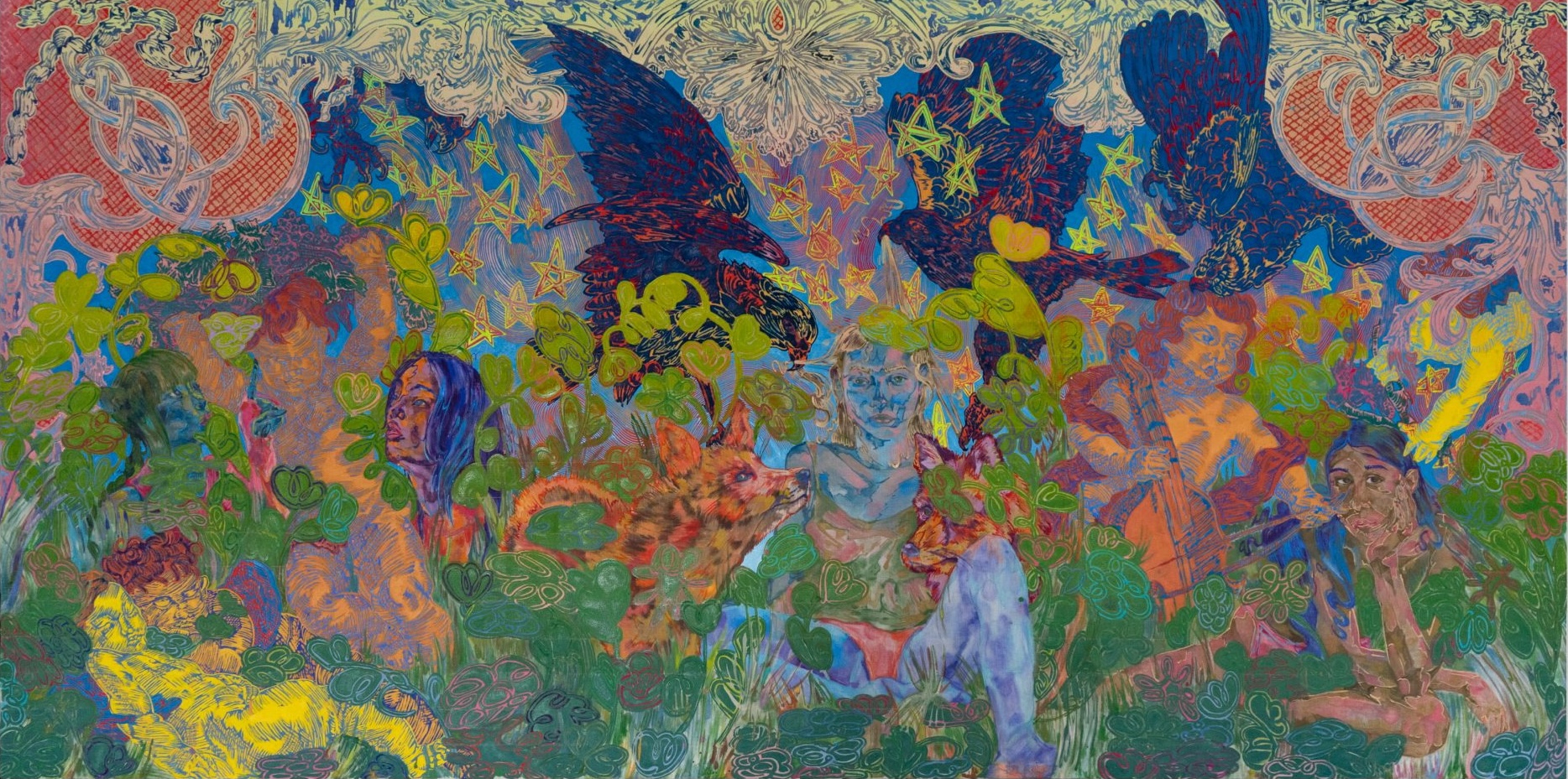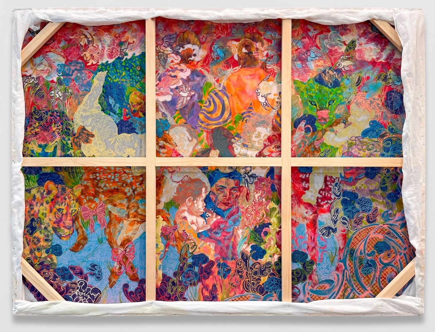 Non si esce impassibili dai quadri di Giuditta Branconi. Semplicemente perché davanti all’esubero di stimolazioni visive non si può indugiare noncuranti e imperturbabili. Su quelle tele s’imprimono codici eterocliti e tradizioni antitetiche che formano un mélange di costrutti visivi. L’effetto mélange è prodotto dalla stringente sutura delle immagini, giustapposte e quasi ibridate le une con le altre. Ci sono nuvole strappate al catalogo dell’antica arte cinese, quelle che, si credeva, proteggessero l’imperatore (Figlio del cielo) e fungessero – segno inopinabile di buon auspicio – da veicolo di trasporto degli immortali. Ci sono gli angeli suonatori di tromba, di stretta osservanza barocca, simili agli Israfil coranici che annunciano il giorno del Giudizio finale (Our Dreams Aren’t Just Dreams, 2024). Ma si trovano anche farfalle e uccelli che evocano i Paradeisos persiani, dove il ductus classico s’imbastardisce con quello del tatuaggio Old School e perfino dei cartoni animati. Queste immagini convivono con quelle di maestosi cavalli criniti, distillati quasi da un mirabolante regesto d’incisioni rinascimentali (I Wish I Was Born a Rich Blonde Girl, 2024). Nell’immaginifico florilegio di emblemi si annidano anche tracce mnestiche di Liberty e Jugendstil e – perché no? – dei Fairy Painting vittoriani, con il loro profluvio di fatine alate (Regina di cuori, 2024).