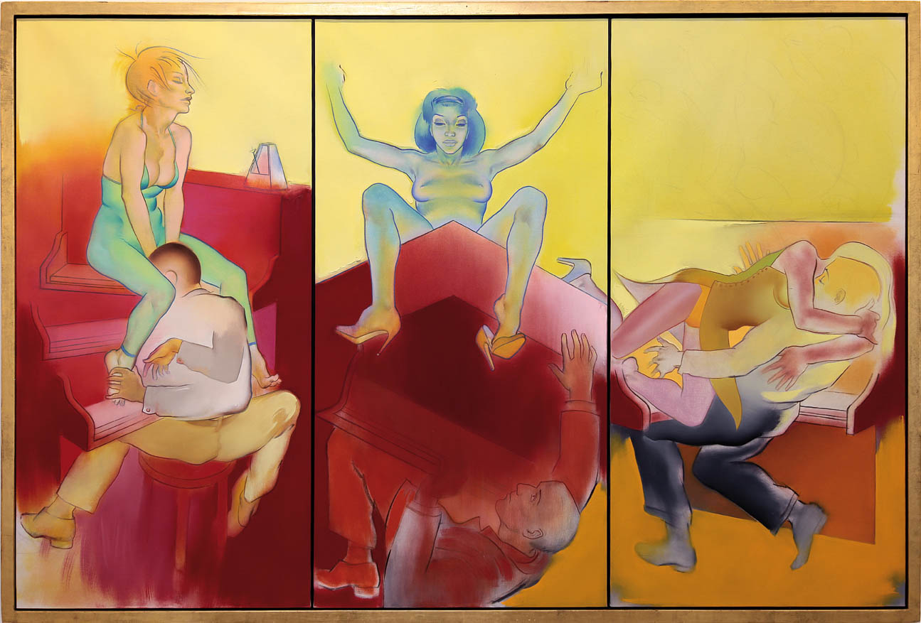 “[…] in America facciamo di tutto ma la gente religiosa è veramente pazza. Sono pazzi riguardo al sesso. […] Quindi in America io faccio il sesso. Voglio dire, dipingo anche ma faccio sesso su videotape e nelle performances. Nelle performances delle donne che fanno pipì, per via dell’AIDS non possiamo avere scambi di fluidi corporali così le donne pisciavano lustrini dorati sulla gente, ma nel video era reale. Lo abbiamo fatto nel mio studio, tutto il pavimento coperto di fluidi e noi ci sguazzavamo.”[4]