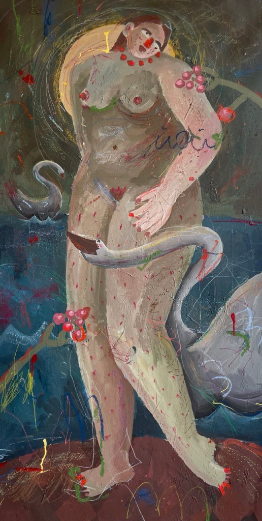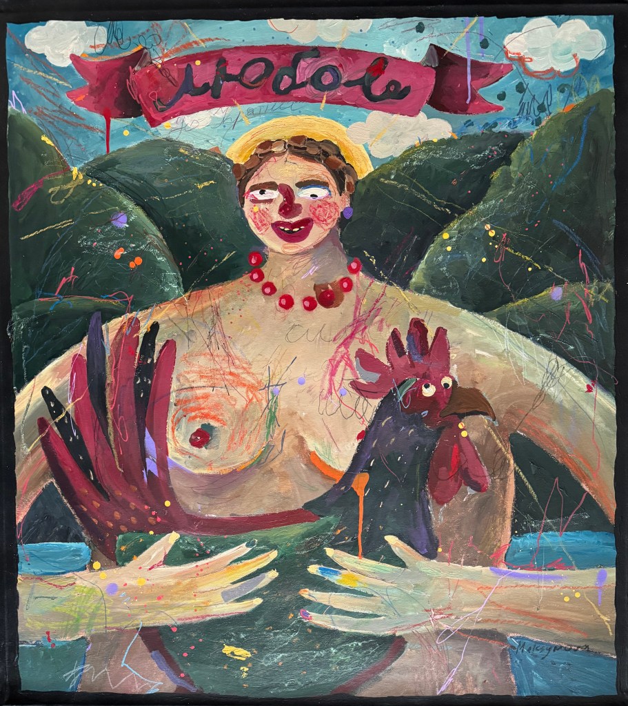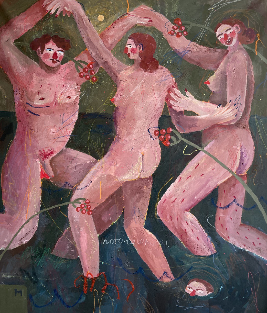 D’altra parte, come dice l’artista, “Con le mie opere figurative e naïf, io do voce ai problemi del mondo che mi toccano personalmente e cerco di promuovere l’uguaglianza e l’interconnessione, sviluppando, allo stesso tempo, i motivi tradizionali del folclore ucraino in nuove forme visive”. Come nel dipinto Holubka Dance, dove il motivo della popolare danza nuziale “Holubka” (che in italiano significa “colomba”) si trasforma in un’occasione per sostituire il paradigma classico della coppia in una più avventurosa esperienza orgiastica. Altro tema iconografico legato al folclore ucraino è quello delle bacche di Kalyna, disseminato in molte opere dell’artista, sia nella naturale forma vegetale in Mother, Becoming a Swan, Cat e Conscience, e sia in foggia di perle nelle collane che cingono i colli delle sue eroine in Don’t Bother, In the Wild Woods e Muses.
