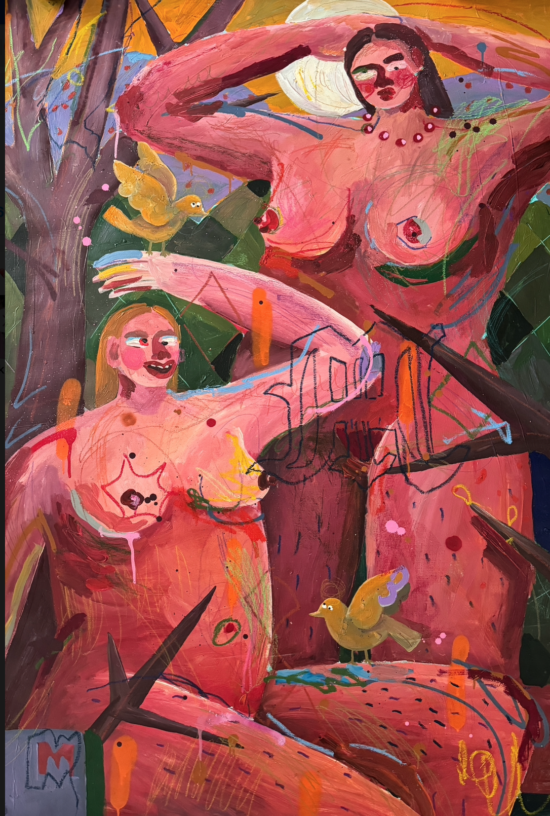 Quelli dipinti da Maksymova sono nudi di ragazze e donne dalla fisicità prorompente, dee di un Olimpo rivisitato, come la Leda di Becoming a Swan o le orgiastiche Muses, che celebrano il lato panico ed erotico dell’esistenza, abbattendo pregiudizi e tabu che da secoli stigmatizzano la fisicità femminile. Ma sono anche fanciulle innocenti, giovani indifese protette da temibili guardiani, come gli animali custodi del dipinto Safekeeper e dell’arazzo Little Princess.