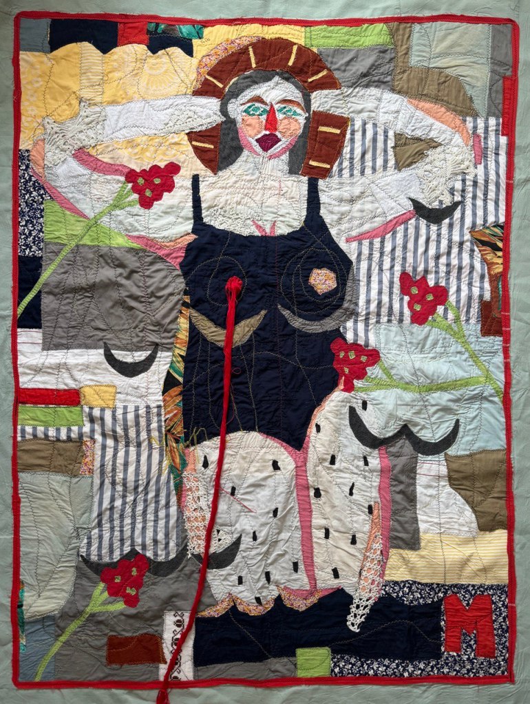 Nelle opere di Iryna Maksymova, la simbologia delle bacche di Kalyna, simbolo della passione e vitalità del popolo ucraino, è anche un’allusione allo spargimento di sangue provocato dalla guerra in corso. In generale, le simbologie usate dall’artista sono sempre duplici, interpretabili sia in senso tradizionale, che in riferimento ai fatti dell’attualità e della cultura contemporanea. Ad esempio, la creazione di arazzi cuciti a mano recuperando scampoli di tessuti è un chiaro riferimento alla produzione tessile del folclore ucraino, ma è, allo stesso tempo, il segno della sensibilità ecologica dell’artista e della sua volontà di evitare ogni spreco attraverso l’upcycling, una pratica creativa che, a differenza del comune riciclo, basato sulla trasformazione dei materiali in nuovi prodotti, conserva le proprietà degli oggetti, reimpiegandoli in modo da essere chiaramente riconoscibili.