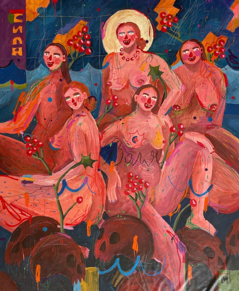 Questo è anche il motivo per cui, dovendo sfruttare pattern e texture dei tessuti, negli arazzi, l’impronta gestuale della pittura di Iryna Maksymova sembra lasciare il campo al carattere ornamentale tipico delle produzioni tessili tradizionali. Anche il dipinto intitolato Odesia, raffigurante un gruppo di donne discinte posate su un cumulo di teschi e incorniciate da grappoli di bacche di Kalyna, può essere variamente interpretato. Da una parte, infatti, il quadro richiama l’immaginario tipico dell’artista, con le sue prorompenti figure femminili che esibiscono fieramente la propria fisicità, dall’altra fa esplicito riferimento, fin dal titolo, alla città portuale considerata la perla del Mar Nero. Odessa, antico crocevia tra Oriente e Occidente, fondata nel XVIII secolo da un napoletano di origini spagnole dove un tempo sorgeva l’insediamento dell’antica colonia greca di Odesso, negli ultimi due anni è stata oggetto di ripetuti attacchi aerei e missilistici russi. Certo, nel dipinto non c’è alcun riferimento diretto a questi fatti, ma allora, come interpretare la presenza di quei teschi?