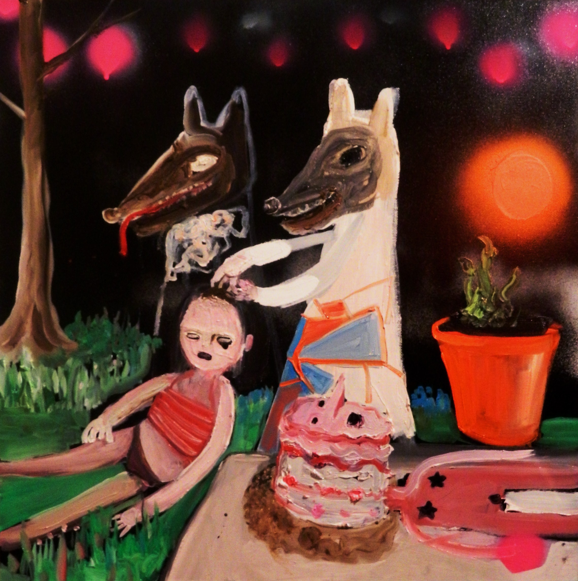 Il giorno finisce presto, titolo ripreso da un dramma teatrale giovanile di Ingmar Bergman, è un progetto nato da una riflessione dell’artista sulla solitudine e la noia, ma anche sul trascorrere del tempo nella dimensione dilatata della psiche, dove aleggiano inquiete larve, minacciosi spettri e mostruose figure di canidi dalle fauci spalancate. Attraverso una pittura dai toni forti e dai colori acidi, che intervalla densi grumi materici e scabre scarnificazioni, Argiolas mette in scena un dramma popolato di eroi violenti e autodistruttivi, ministri di un culto efferato, di una liturgia dissoluta, che equipara vittime e carnefici. Il suo è un teatro di crudeltà e afflizioni, declinato in una sequela di atti unici, simili, per certi versi, alle formelle medioevali con le raffigurazioni dei supplizi infernali, ma a differenza di queste, privi di ogni sottinteso moralistico. “Mi pongo di continuo domande sui comportamenti umani”, confessa l’artista, “senza però esprimere alcun giudizio, perché non voglio essere io a distinguere i buoni dai cattivi. Un compito che, al limite, lascio allo spettatore delle mie opere”. Non è un caso, infatti, che i suoi psicodrammi paiono consumarsi in un clima sorprendentemente festoso, di orgiastica comunione panica, che quasi contrasta con la truce lascivia dei personaggi.